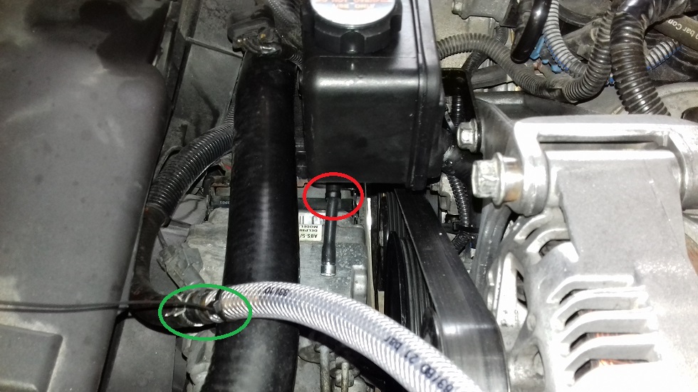 3) Der Servoölbehälter ist ja noch leer, also die Rücklaufleitung (grüner Kreis) abziehen und mit Hilfe einer Schlauchverlängerung in einen Auffangbehälter stecken und den Schlauchanschluss am