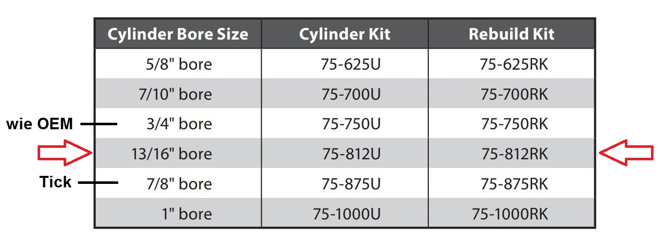 Tilton stellt die Zylinder aber auch noch in anderen Größen (siehe Tabelle) her, wobei der 13/16 Zoll Zylinder mit seinen 20,7mm Durchmesser genau in der Mitte liegt.