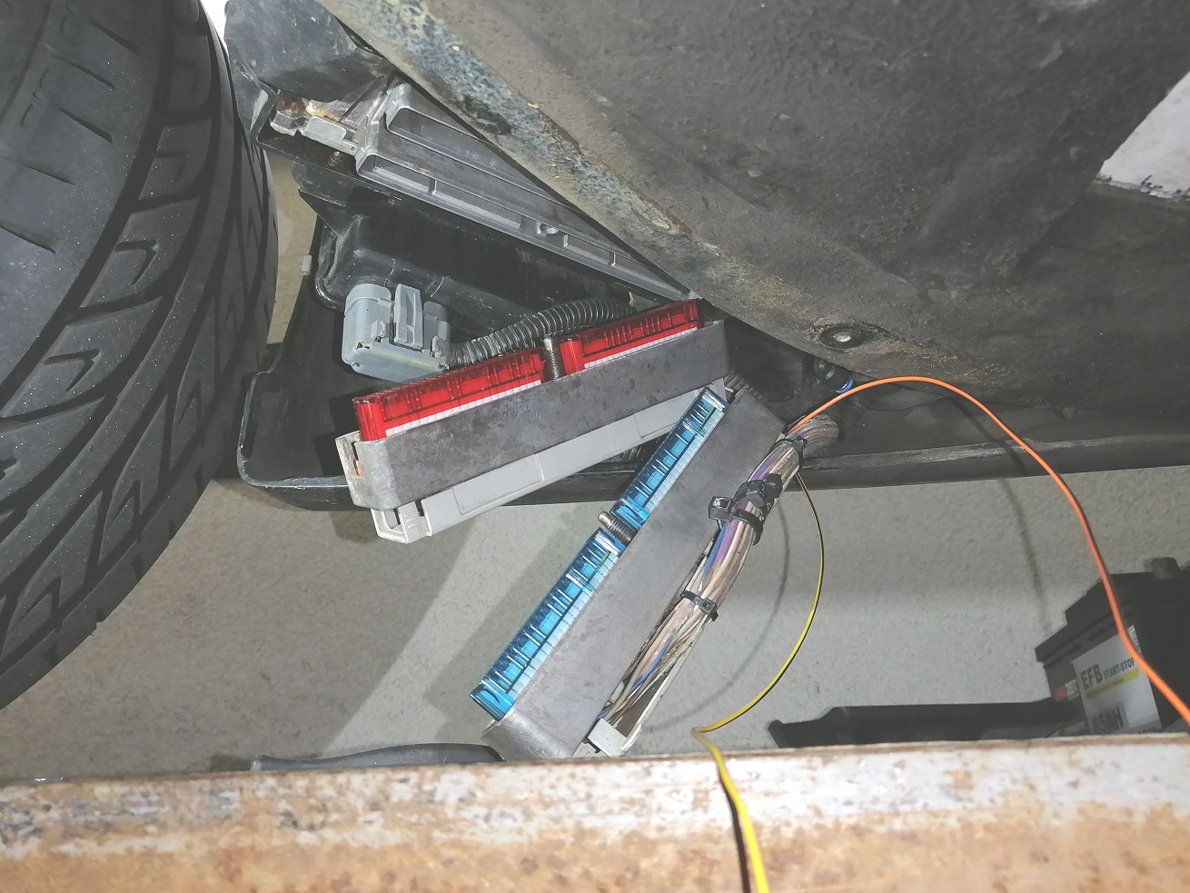 Das gelb/schwarze Kabel für den Signaleingang pinnt man auf PIN 51 des roten Steckers, das orange/schwarze Kabel für die Referenzspannung auf PIN 53 des blauen Steckers.