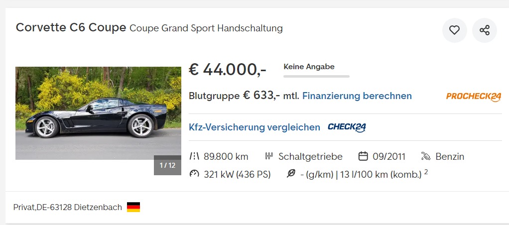 Die corvette kenne ich auch schon. Habe mal mit dem Typen geschrieben, Fahrzeug steht in Polen und die steht auch schon ewig drin. Wirkliche Nachweise zu allen Sachen hat er nicht. So um Juni / Juli stand sie schon mal drin, damals für 45.000 €. Der geht vom jeden Monat 1-2000€ runter weil die niemand will.