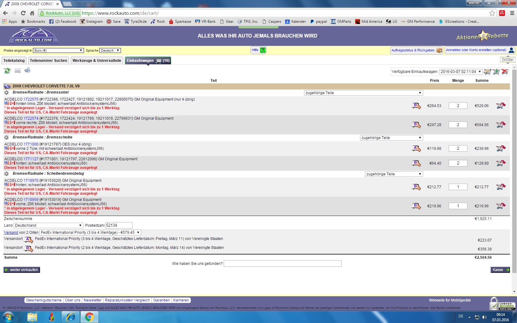 Hallo Frank,bestell die Anlage mal mit GM Bremsbelägen bei Rockauto! Schau auch mal ob die alles liefern können. Mir fehlte eine Bremszange vorne und ich wollte dort bestellen. Laut Internet lieferbar,aber wurde dann storniert. Wenn man die Fracht draufrechnet ist es teurer.