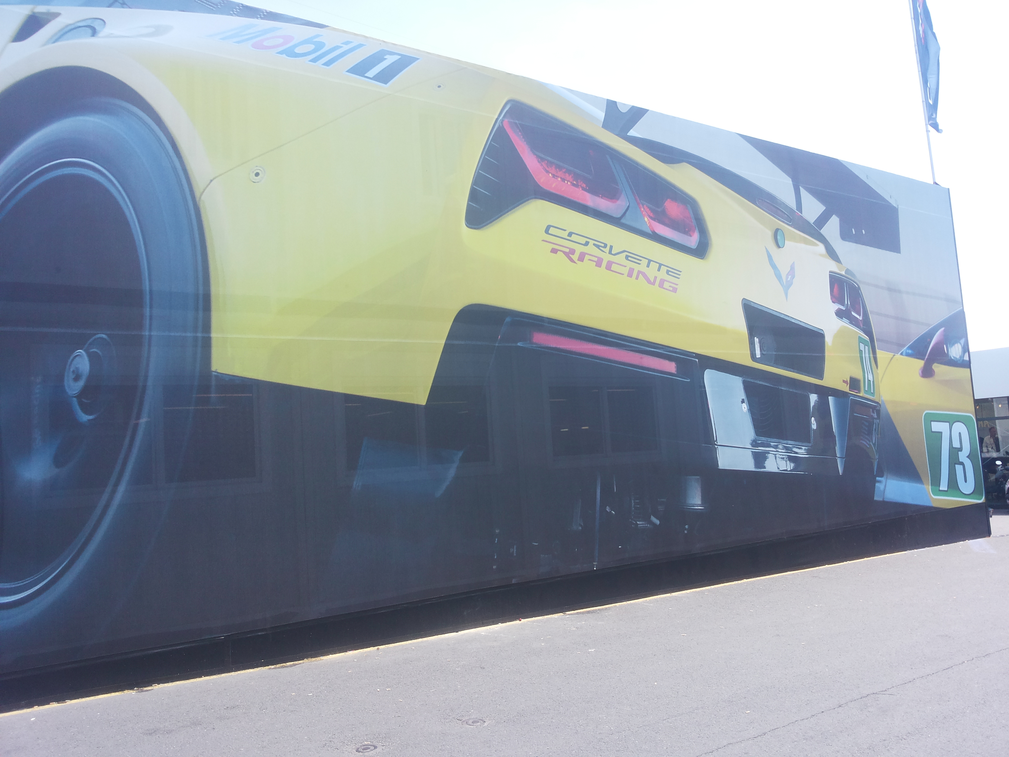 Das Riesenbanner bedeckt das hospitality Gebäude von Corvette Racing im fahrerlager.