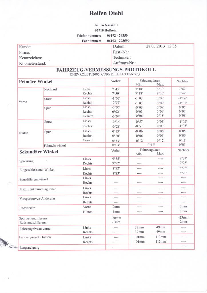 Möchte im Frühling meine C6 LS3 mit Serienbereifung, Tieferlegung mittels Stellschrauben und Distanzscheiben auch mal wieder neu vermessen lassen.