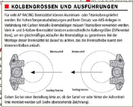 Also ich kenne das immer nur so, das der kleine Kolben immer unten sitzt, man fängt mit weniger Druck an und steigert den zum Auslaufen der Scheibe. Anbei ein Bild von den Rennsättel wie sie im GT Masters SLS und den Callaway Corvetten verbaut sind, in dem Fall sogar mit Pfeil für die Richtung
