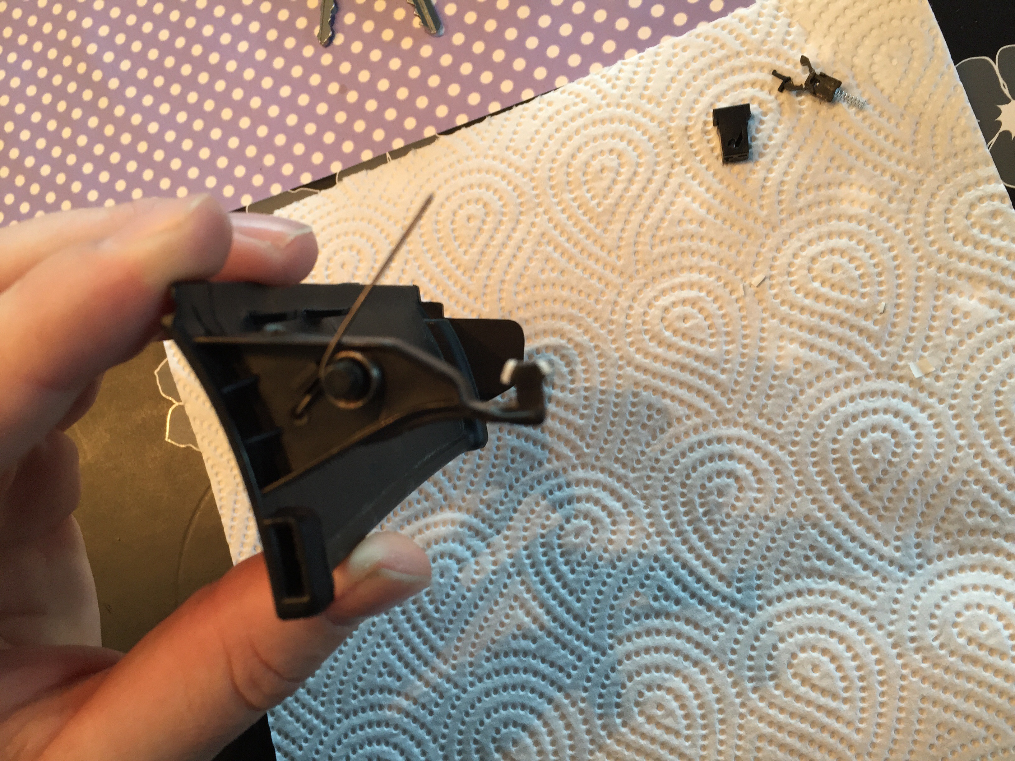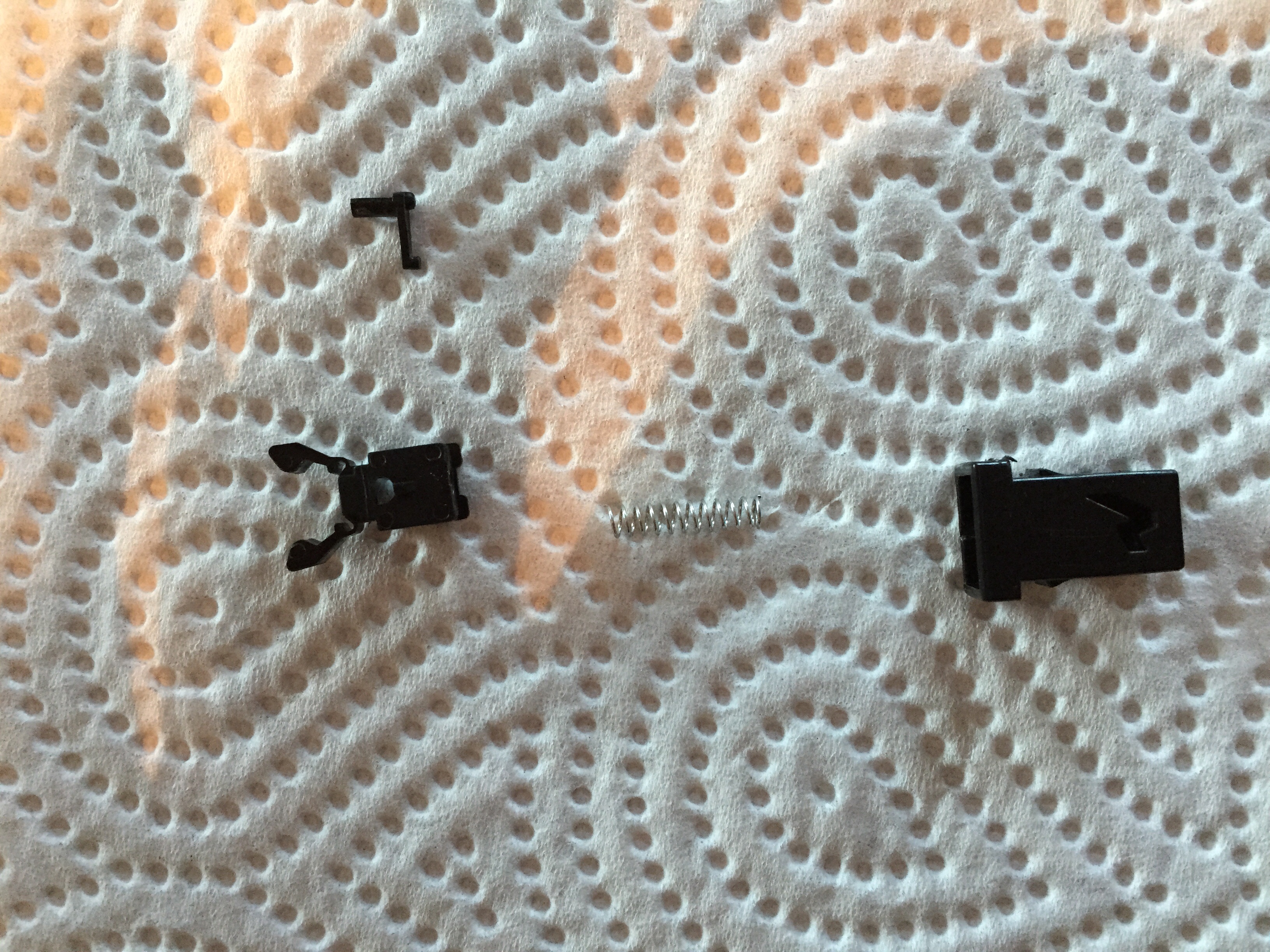 Dann die federspannung der Türe etwas reduziert in dem man die Feder etwas biegt und diesen Halter an der Klappe mittels 2 Klebern vergrößert. Als letztes habe ich den kleinen Halter auseinander gebaut und die Spiralfeder ein wenig gekürzt.