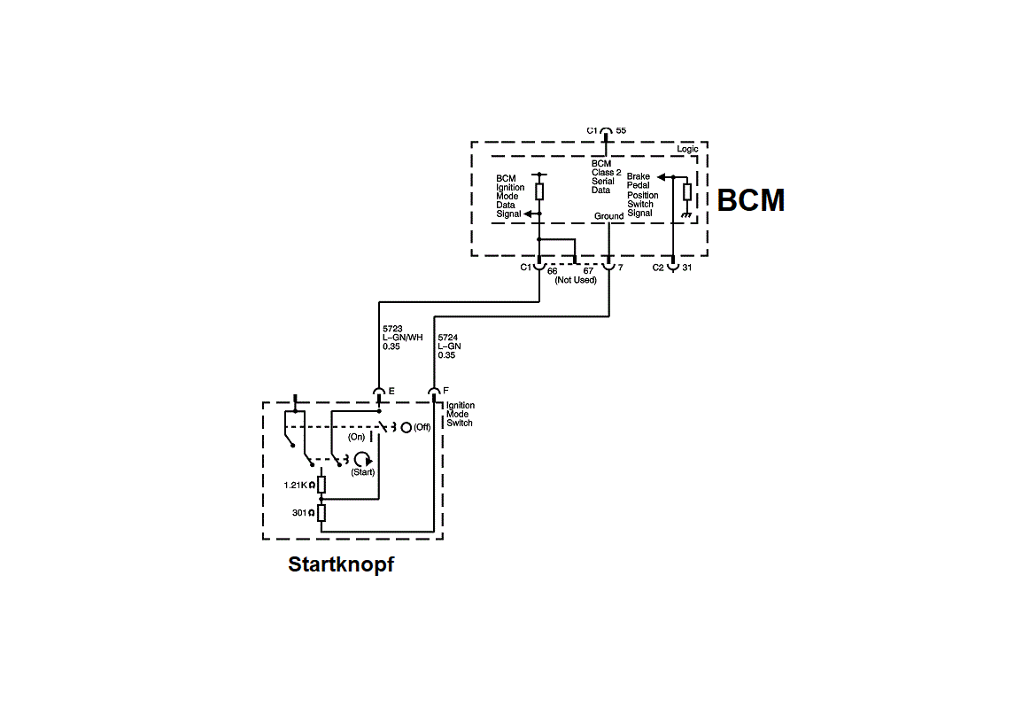 Durch drücken des Startknopfes wird ein 1500 Ohm Widerstand zwischen Pin 7 und Pin 66 des oberen, linken Steckers am BCM geschalten.
