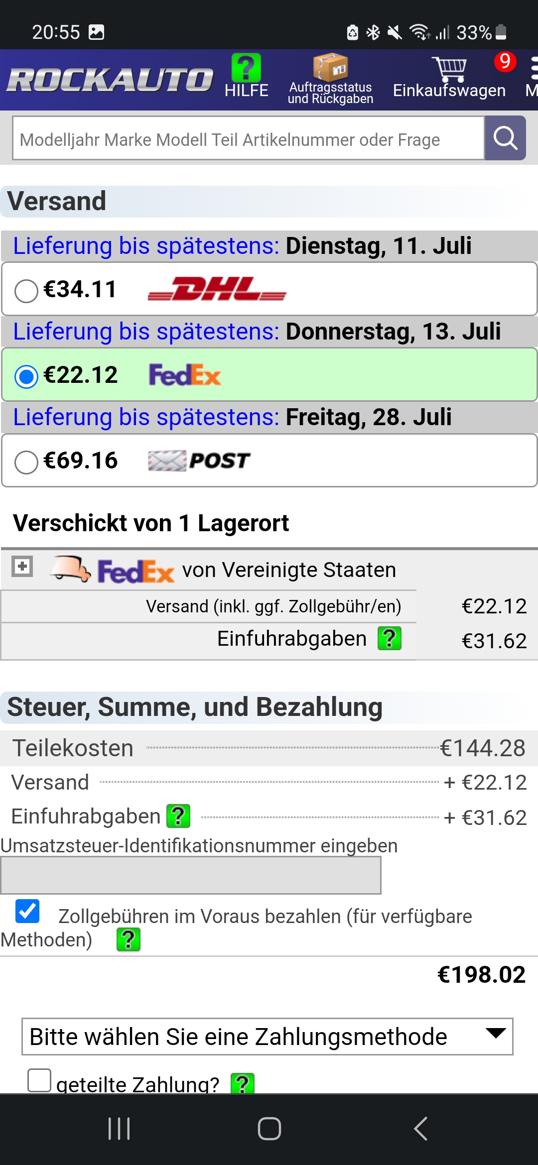 hab in den letzten Wochen zwei Bestellungen über Rockauto gemacht..... super schnell geliefert, alles zum Toppreis. Absolut empfehlenswert, gerade weil man die Einfuhrumsatzsteuer und Zollgebühren gleich mit bezahlen kann und ich nicht erst hier zum Zoll laufen muss, um dort meine Ware abzuholen