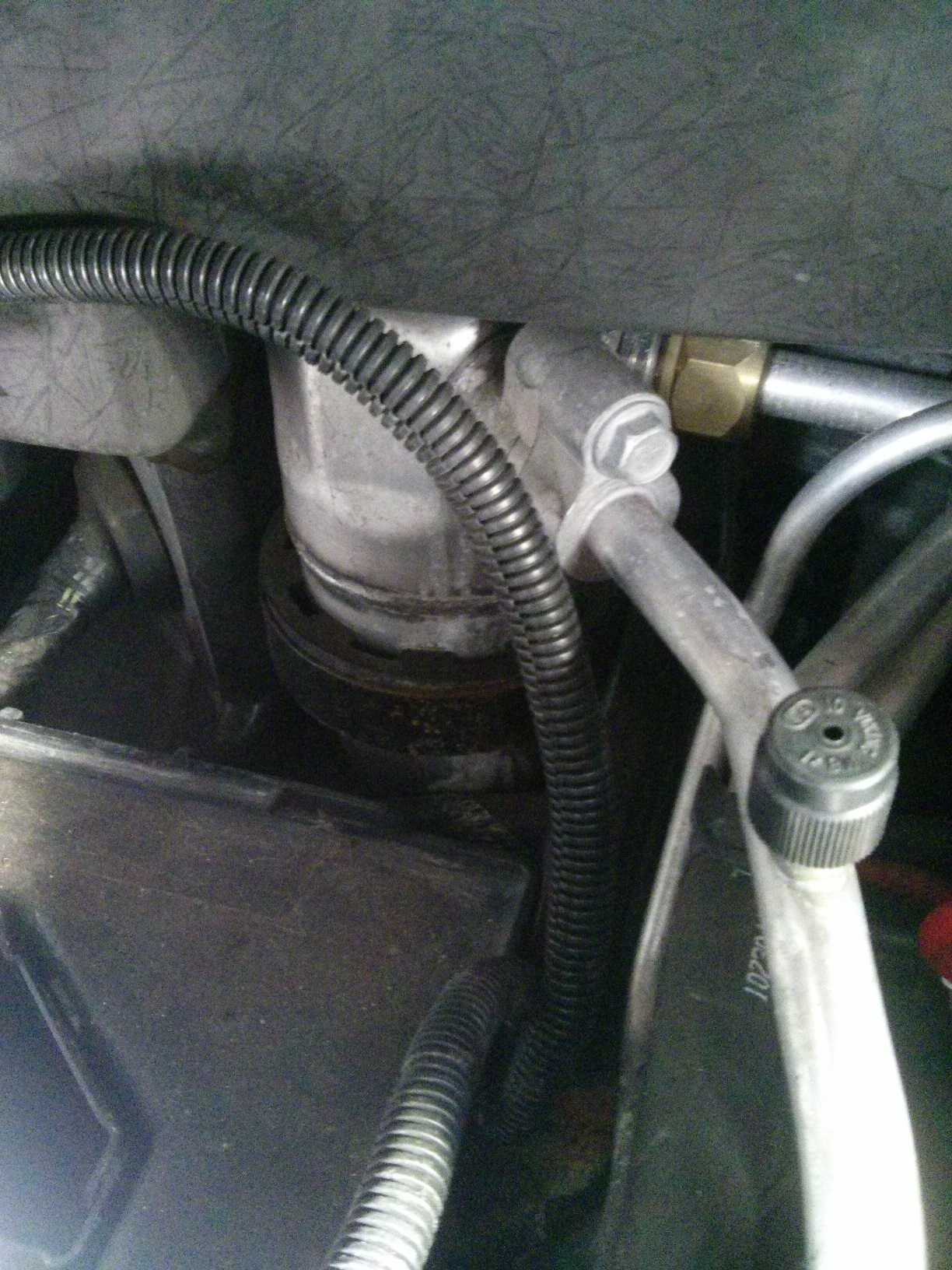 Der Kompressor sitzt beschissen unten am Motor, unter Krümmer und der Wapu. Leitungen zum Kondensator unten und zum Trockner. Krümmer oder Wapu werden raus müssen.