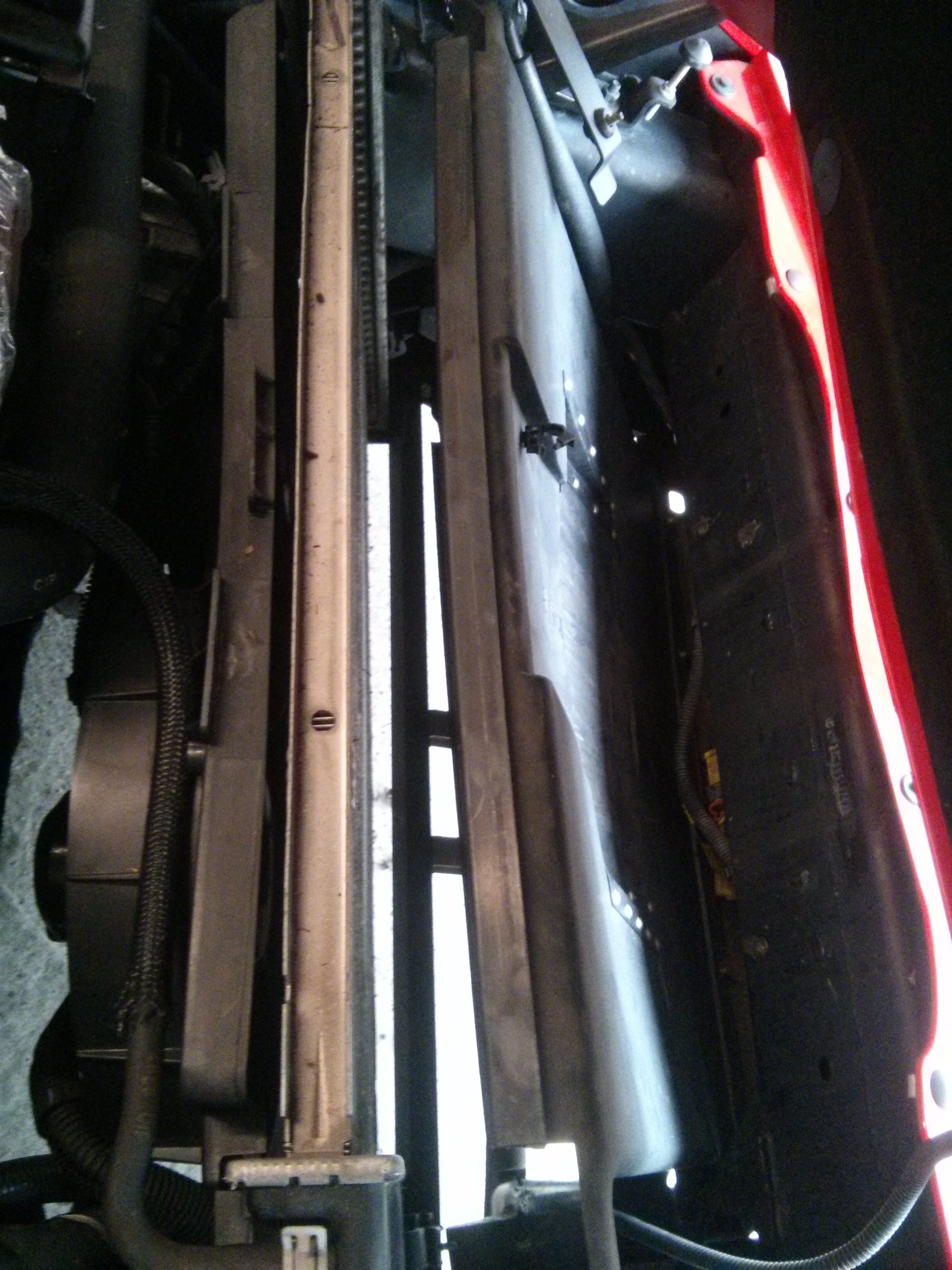 Das ist echt ne Drecksfummelei. Erstmal ein Stück nach oben ziehen, dann rastet die Verankerung aus. Jetzt muss man ein Stück rauf und dann die untere Anschlussleitung am Kühler vorbeiziehen, dabei den Kondensator drehen, fluchen, neu versuchen usw... Auf den Wasserkühler aufpassen!!!
