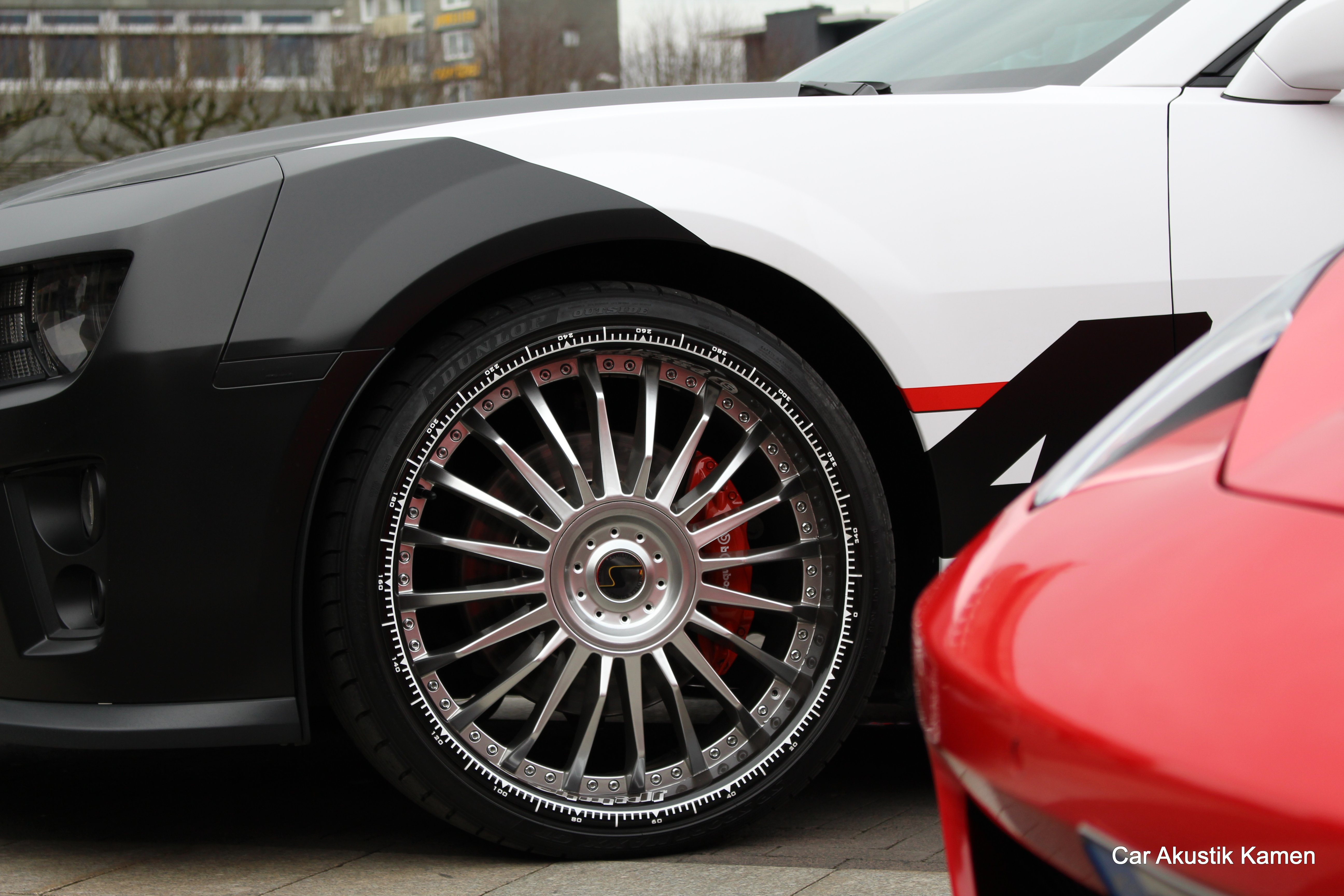 Die Felgen wurden im Bett schwarz foliert und dann die weissen Aufkleber installiert.