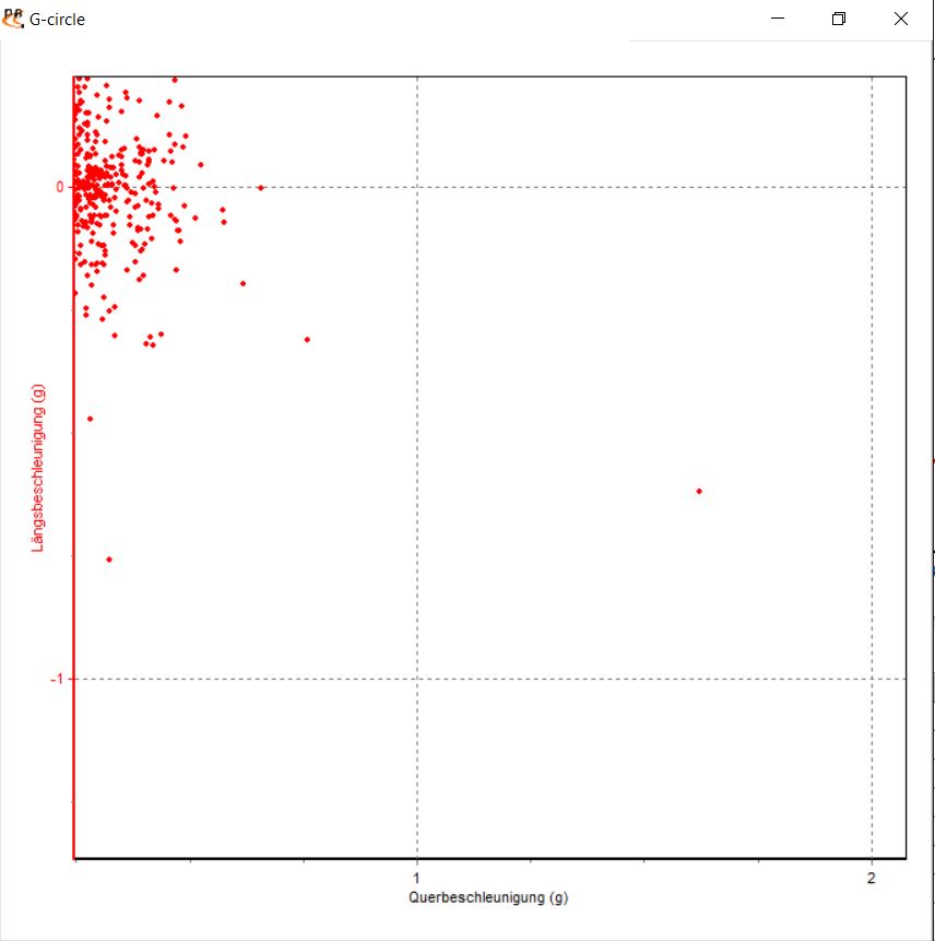 Du siehst, wenn mir jetzt nur der höchste Wert angegeben worden wäre, müsste ich glauben mit 1,6G die AB-Auffahrt/Ausfahrt (keine Ahnung mehr) genommen zu haben. So kannst Du ganz genau erkennen, dass es nur ein einziger Peak war, der vermutlich durch Rutschen o.ä. zustande kam.