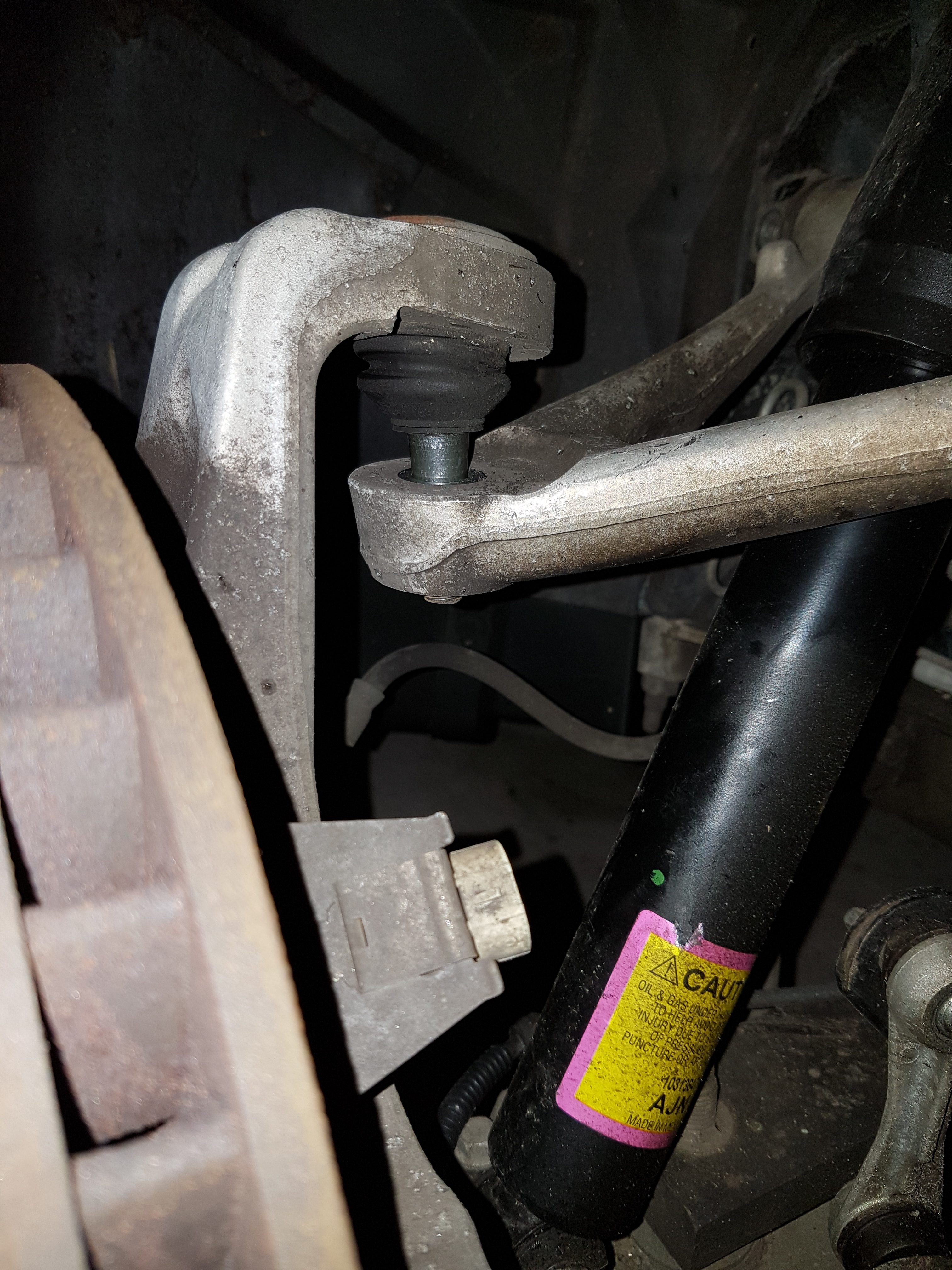 Jetzt ist das untere Kugelgelenk dran. Theoretisch könnte man auch nur den unteren Querlenker lösen um die Gummis zu tauschen, wenn das Gelenk in Ordnung ist.