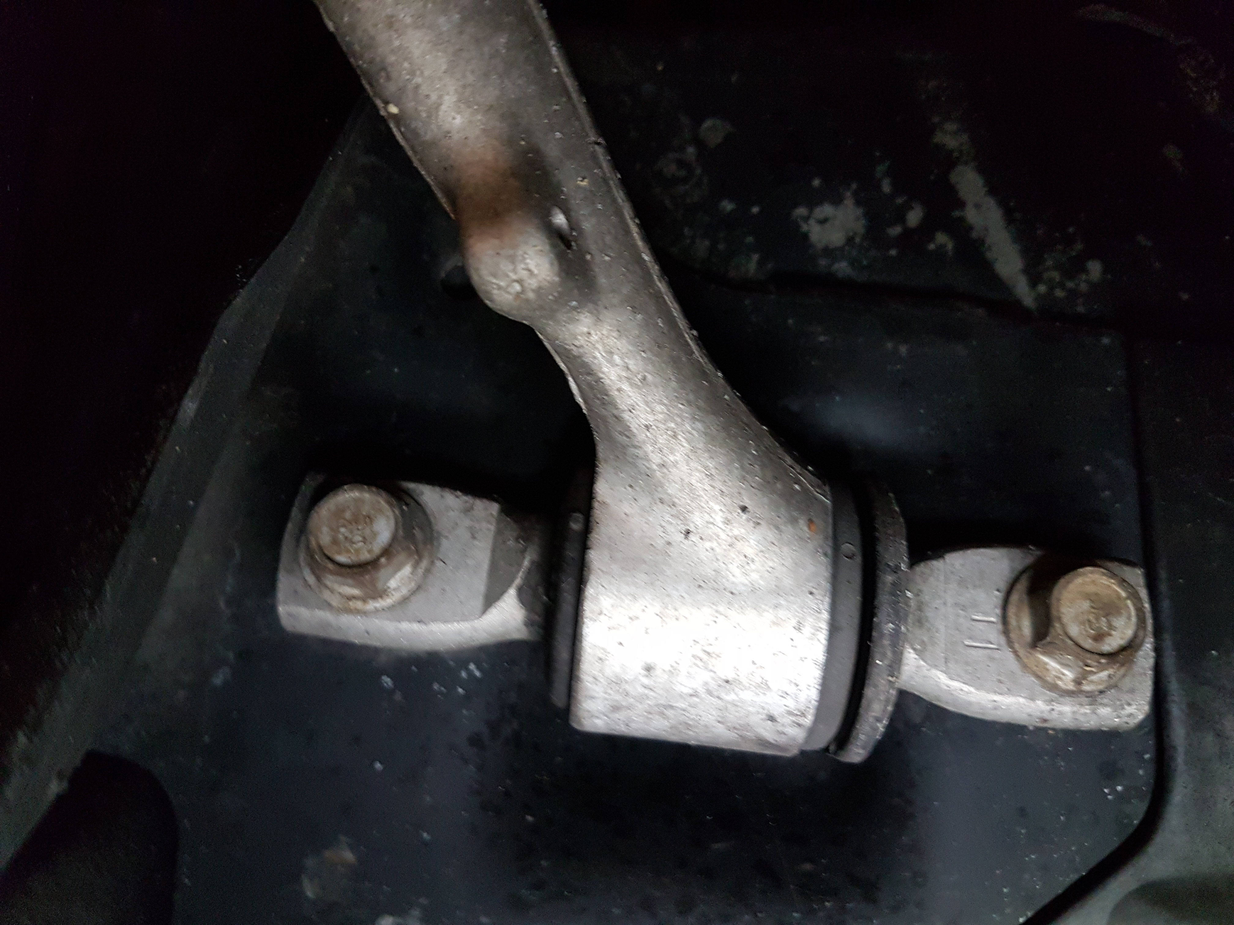 Erst danach kommen die Schrauben raus. Muttern anlösen (21er), dann klappt der Querträger runter. Dann können die Schrauben raus. Querträger rauswackeln, und am besten die Schrauben wieder mit Scheiben an ihren Platz zurück.