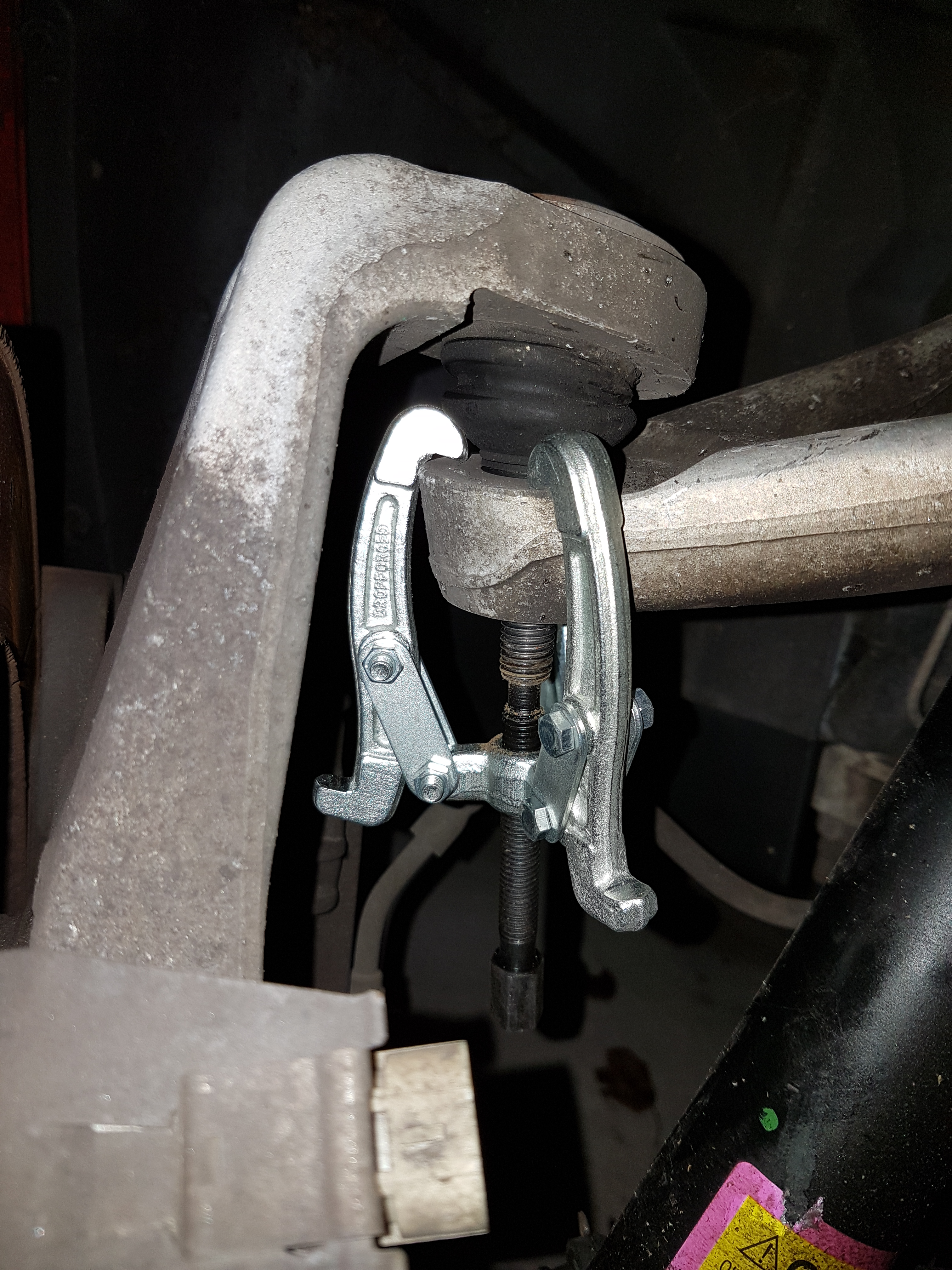 So ähnlich auch beim oberen Kugelgelenk, nur passt hier der Abzieher mit den drei Klammern. Auch hier wieder sauber aufsetzen! Sobald beim Anziehen was kippt, von vorn beginnen.