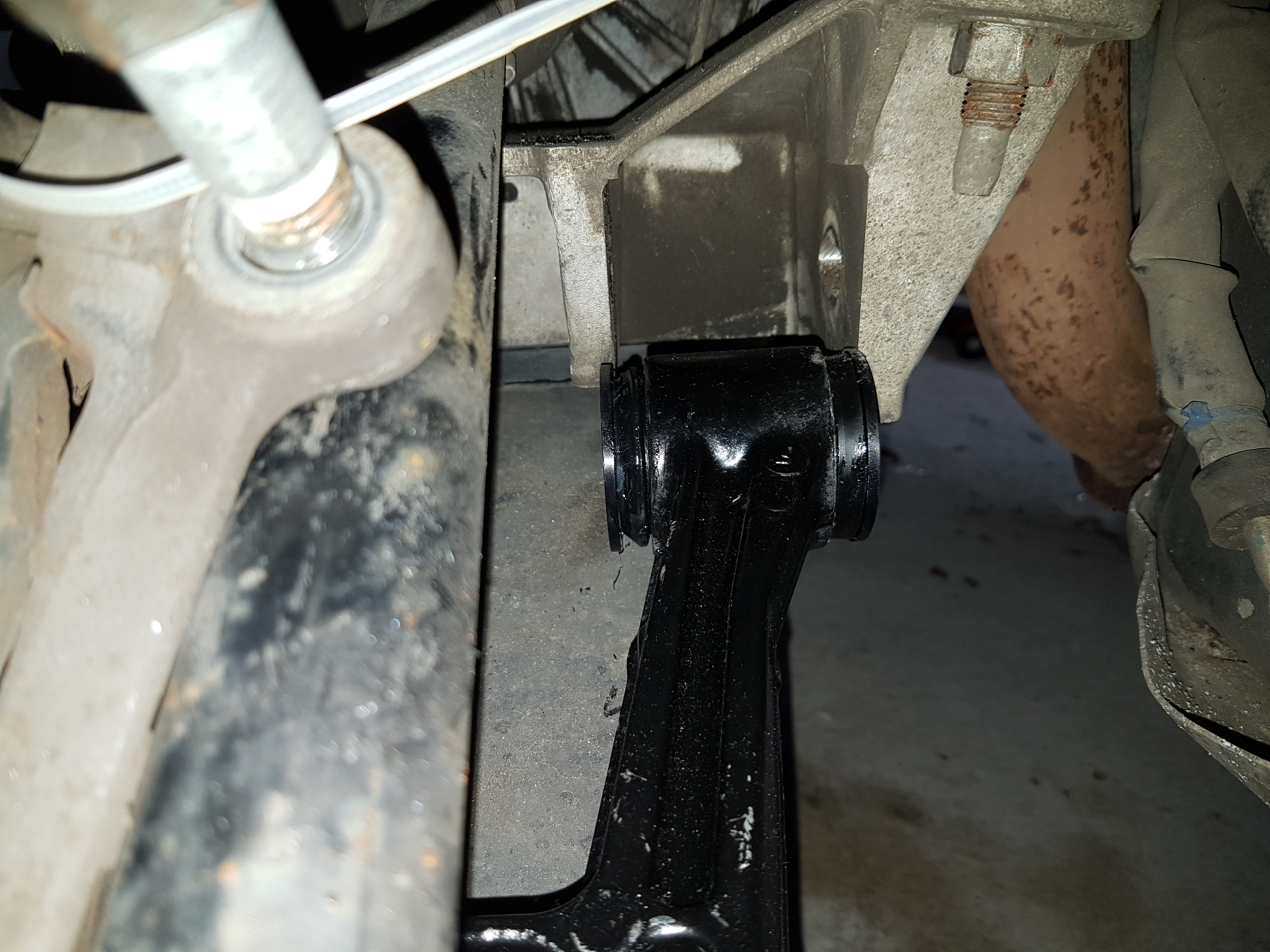 Unteren Querlenker in Position bringen und ggf. mit Gummihammer reintreiben, Schrauben wieder durch und mit passender Markierung festziehen. Drehmoment egal, halt fest, muss eh vermessen werden.