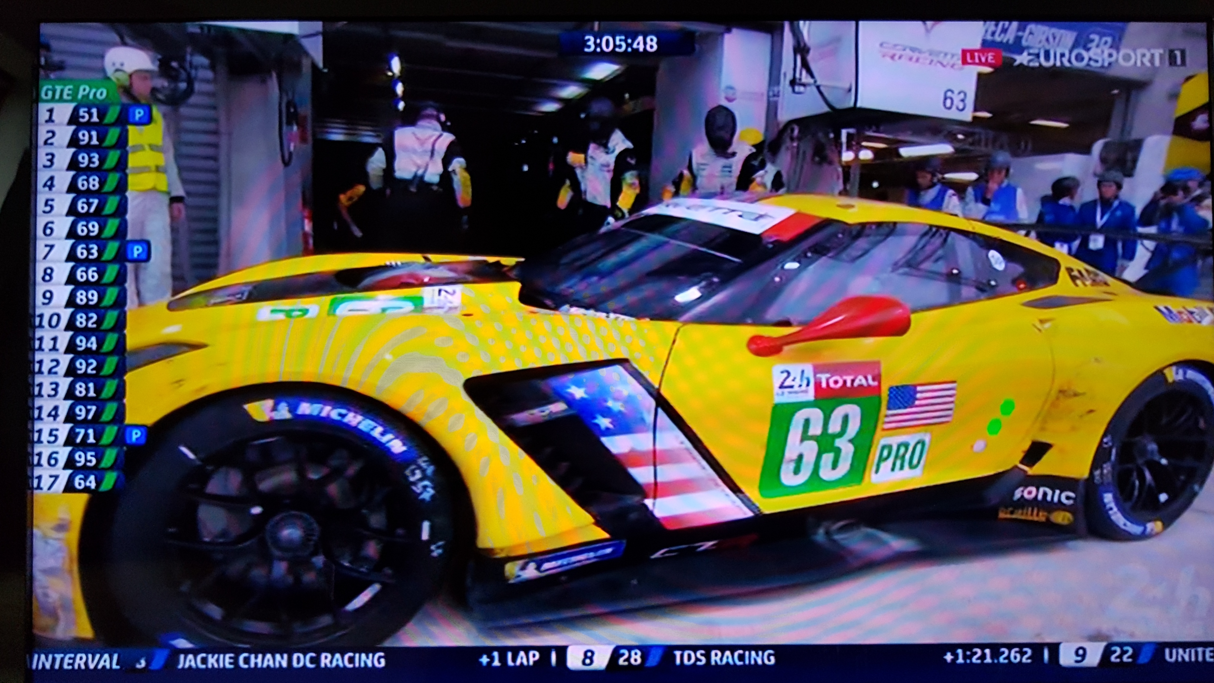 3 Stunden vor Schluss führt der #51 Ferrari von AF Corse in der GTEpro denkbar knapp vor der #63 #Corvette. Aufgrund der Safety Car Phase wegen dem Crash von #29 Racing Team Nederland (Bilder) wurde die Gruppe aufgrund der Aufteilung in drei SC Gruppen allerdings weit auseinandergerissen. Es wird schwer.