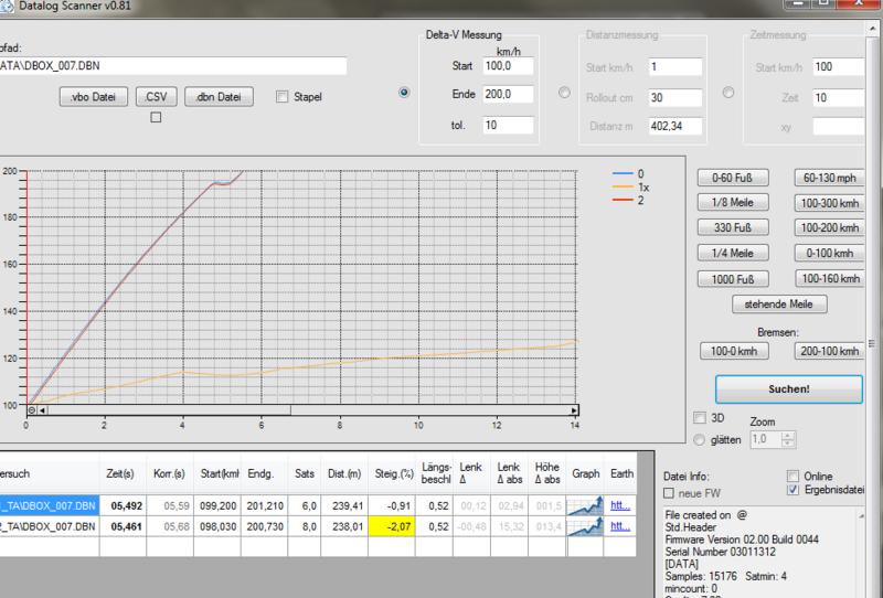 Ein viel größeres Problem ist aber die Messstrecke selbst. Autobahnen, die schnurgerade und absolut eben verlaufen, gibt es nicht so viele. Hat die Messstrecke bspw. eine leichte Steigung, muss das Fahrzeug zusätzlich gegen die Hangabtriebskraft ankämpfen und somit geht ein Teil der Beschleunigungsleistung verloren, was zur Konsequenz hat, dass die ermittelte Zeit schlechter ist. Beim Gefälle der Strecke ist es genau anders herum und die Zeit wird besser. Das korrigierende tool der Racelogic gleicht Streckenunebenheiten kontinuierlich aus, indem das GPS unmittelbare Höhenanstiege bzw. Gefälle bei kontinuierlicher Geschwindindigkeitsänderung in die Zeitenbewertung mathematisch/physikalisch miteinfließen läßt.