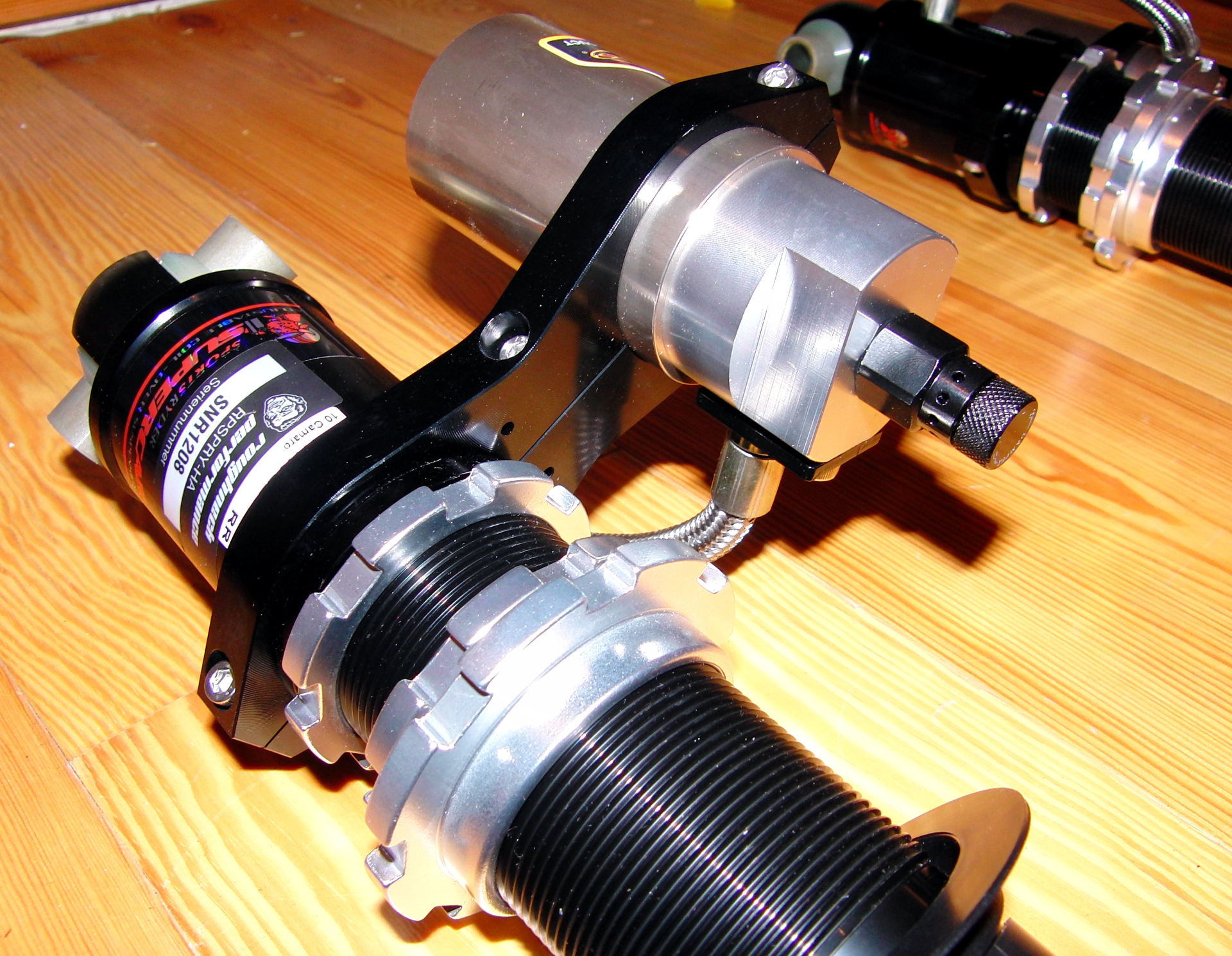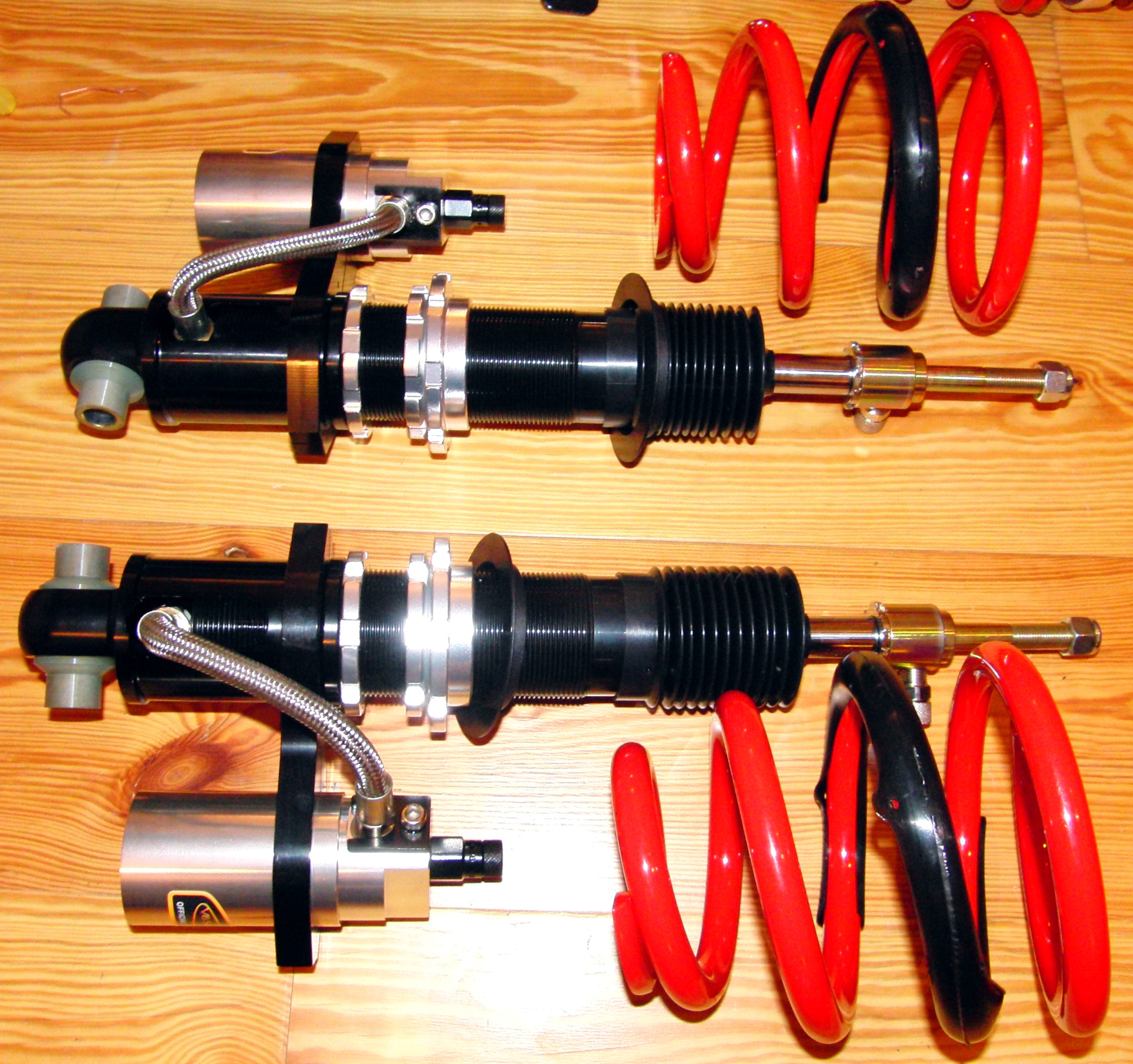 Das bisher verbaute KW V1 Fahrwerk musste auch weichen. Nachdem ich die vorderen Dämpferkartuschen bereits einmal wechseln musste, und auch mit den neuen Kartuschen kaum Verbesserung eintrat (Ölverlust, klappern,...), war klar, dass das V1 am Limit war. Um zukünft flexibel zu sein, was diverse Fahrsituationen angeht - vor allem auch um unterschiedliche Einstellung auf der 1/4 Meile vs. Strassenverkehr fahren zu können, war ein voll verstellbares Fahrwerk nötig. Das Pedders Supercar Kit erhielt am Ende den Zuschlag. Die Verarbeitungsqualität ist jenseits von perfekt, und die Ergebnisse diverser Umbauten in den Staaten sprachen für sich.