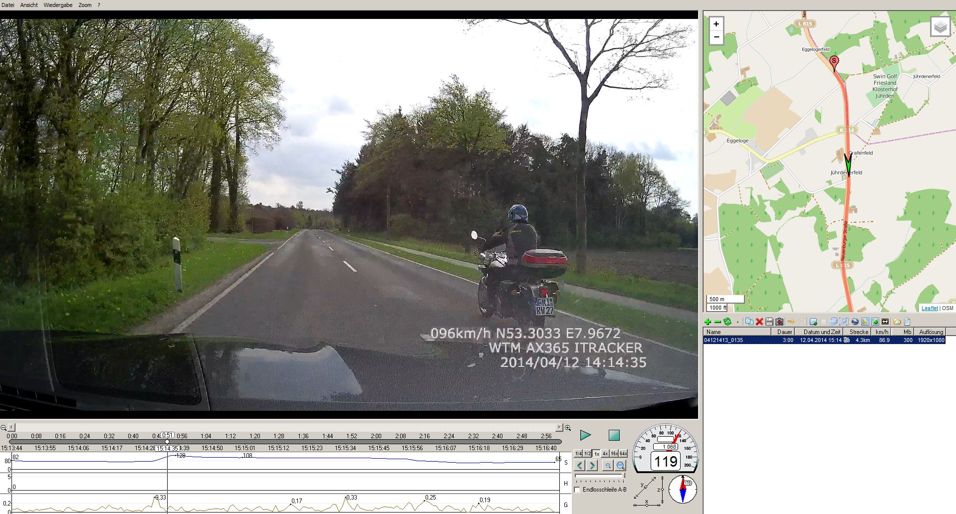 und bin sehr zufrieden. Mitgeliefert wird eine Anzeigesoftware mit Kartendarstellung, Koordinaten, Geschwindigkeit, G- Kräften. Siehe Screenshot ... Nimmt auch Ton auf - Vorsicht![biggrin [smilie=biggrin.gif]](./images/smilies/biggrin.gif)