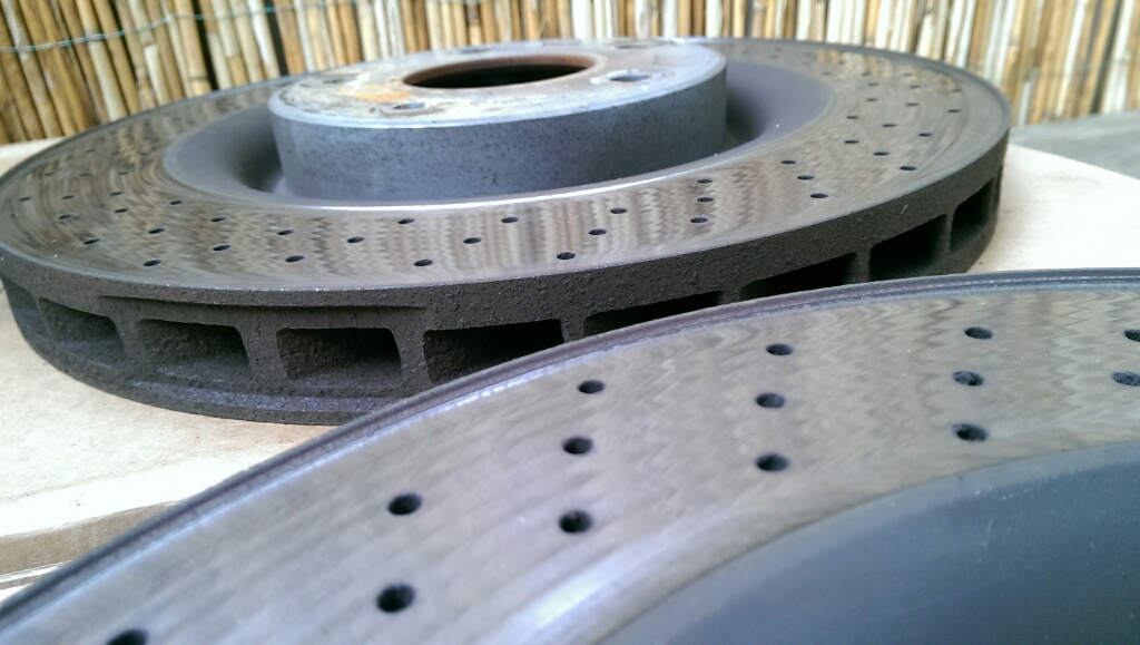 Die Bremsklötze sind fast neuwertig, die Scheiben haben noch viel Materialstärke aber doch schon einen fühlbaren Grat.