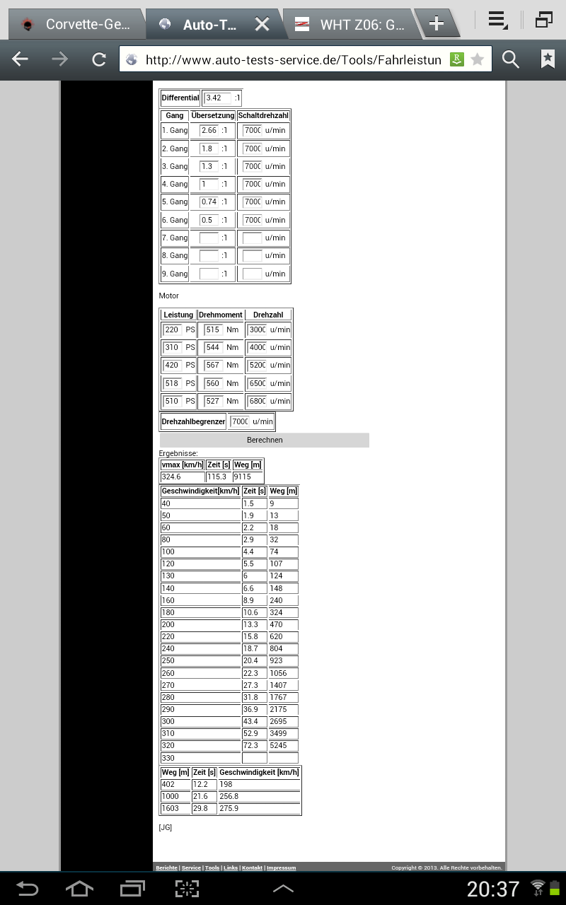 Ich habe auf grun des Höhren Auftriebes bei Hohen Geschwindigkeiten den Cw-Wert auf 0,33 korrigiert uund nun mit einer P max von 525 Ps rechnen lassen. (Erster Screenshot)
