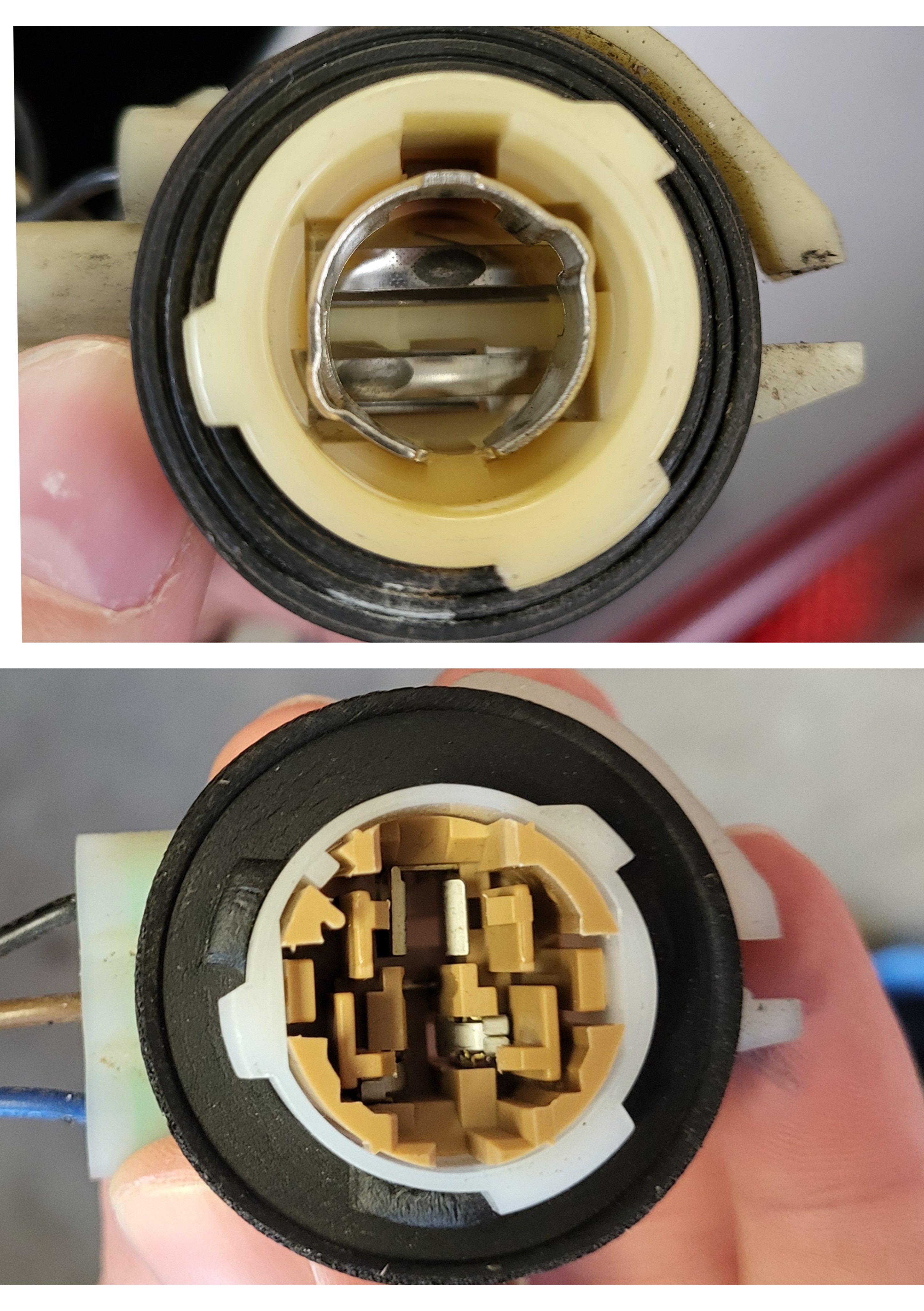 Der Teil der noch in der Fassung ist, sollte Minus sein und die anderen beiden Plus je nach Schlusslicht oder Bremslicht haben.