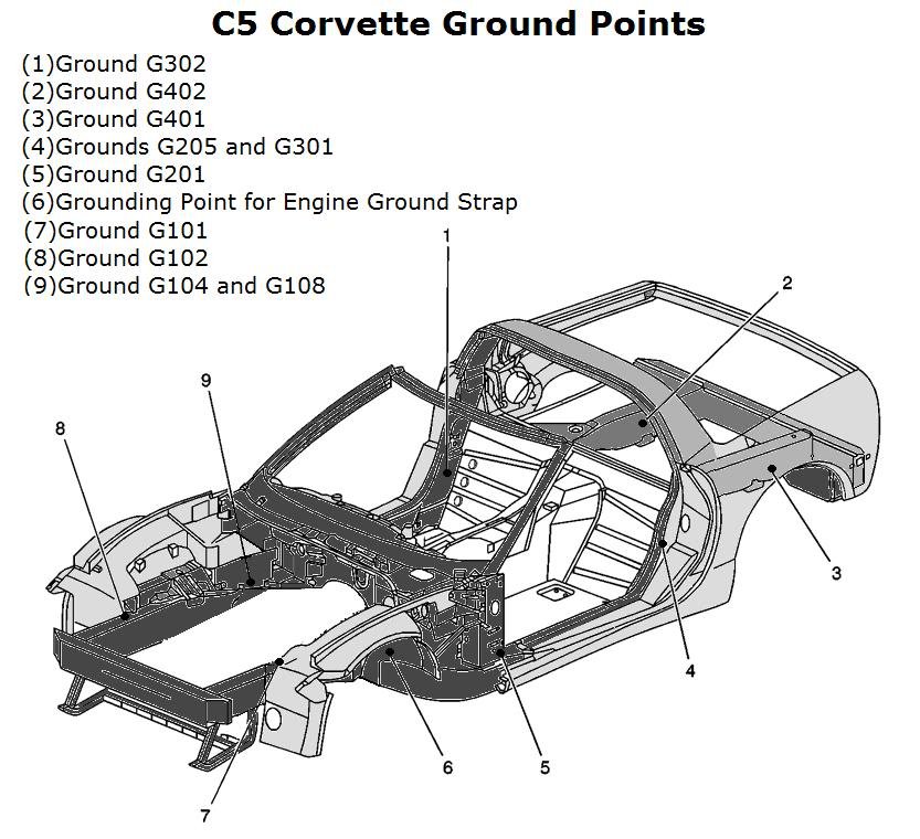 It is recommended that any C5 owner that has had or who are having electrical issues, examine and clean the chassis ground connectors. This may save you from needlessly replacing expensive electronic modules. Each ground connector can be disassembled and cleaned in about 20 min.