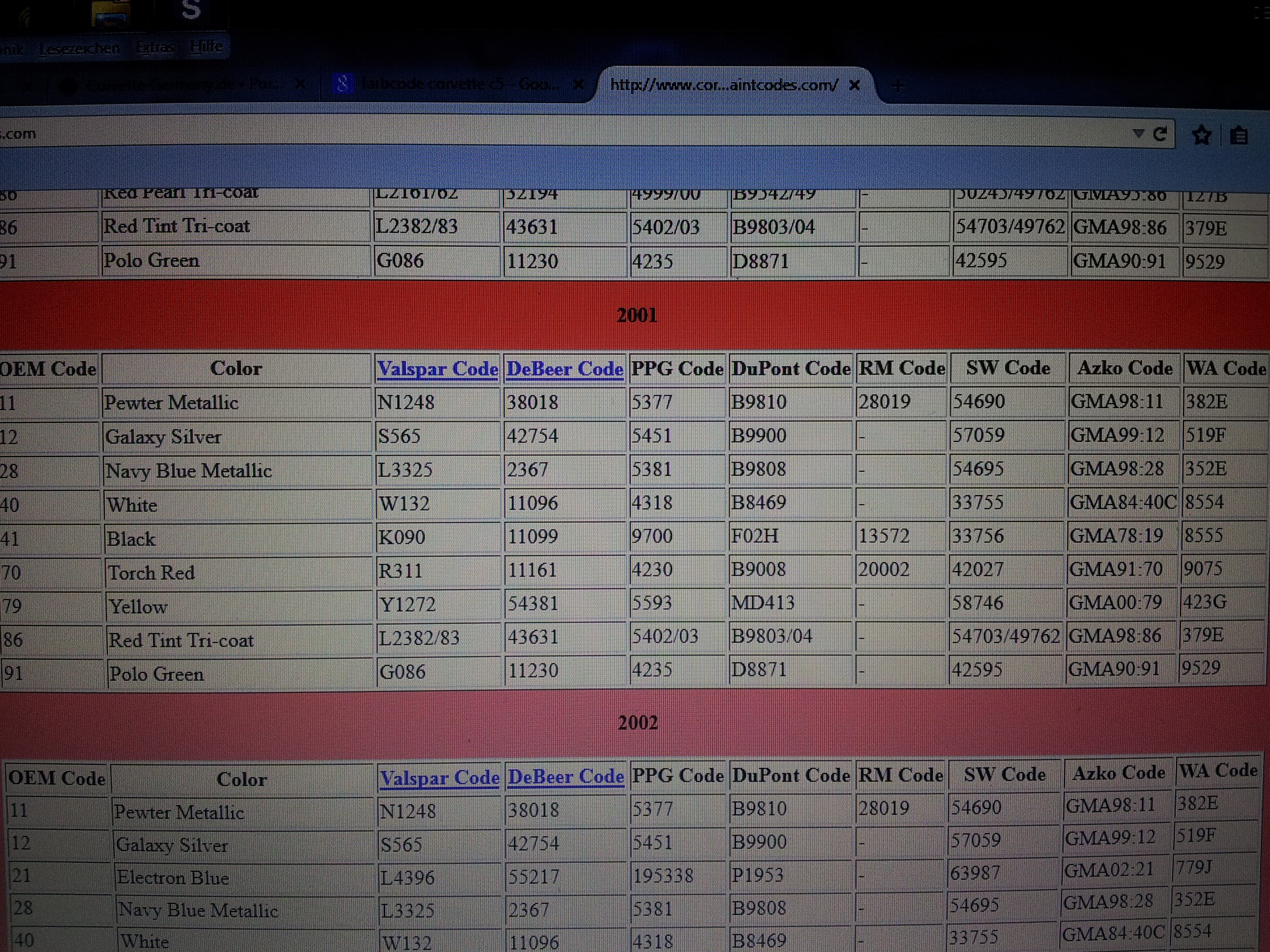 http://www.corvettepaintcodes.com/OEM Code Color Valspar Code DeBeer Code PPG Code DuPont Code RM Code SW Code Azko Code WA Code