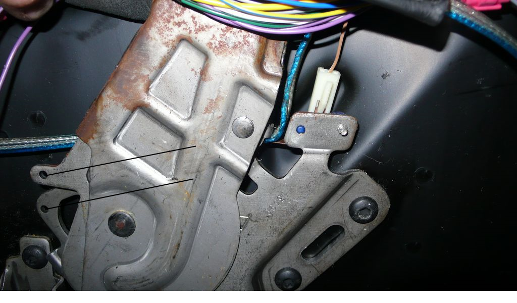 Ich denke, jetzt kann man das Problem auf den Punkt bringen: Wenn man den Service Manuals für mehrere Jahrgänge der C5 glaubt, wird der "automatic adjuster" blockiert, indem man nach Ausbau eines Bremskabels und dessen komplettem Rückziehen ohne Übedehnung die beiden markierten Öffnungen zur Deckung bringt und dann mit einem Kabelbinder oder Stift fixiert. Nach Wiederanbringung des Bremskabels werden Kabelbinder/Stift wieder entfernt. Anschließend soll der Handbremshebel drei Mal angezogen und gelöst werden,um den "auto adjust" auszulösen.