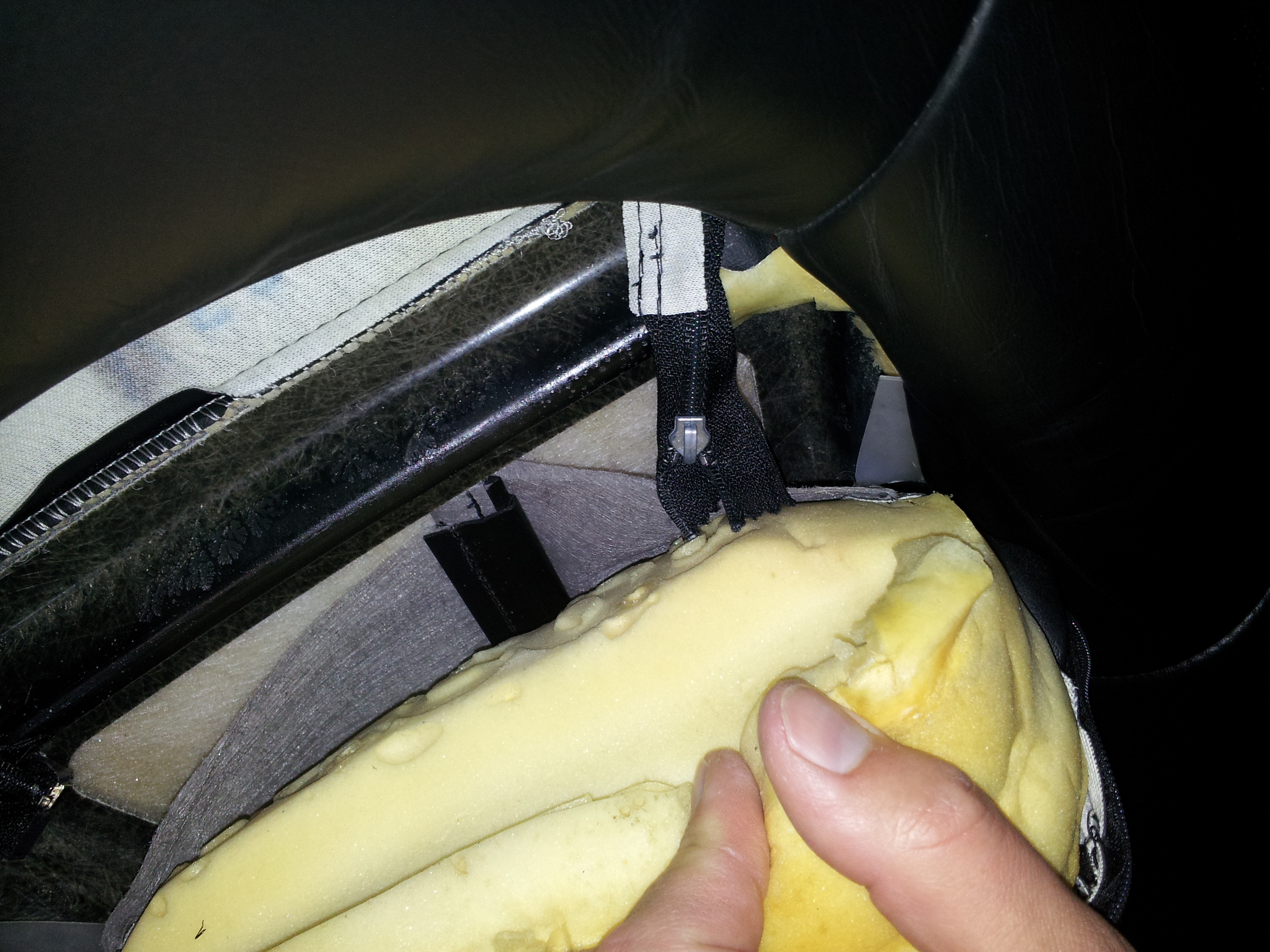 Keine Chance den Bezug abzubekommen! Hab dann aber die Seitenwangen etwas von der Sitzfläche abbiegen können und dann kamen, glaube ich, die Schläuche zum Vorschein. Hatte aber keine Chance da dranzukommen! Und zwar, weil alles von diesen schwarzen Stopfen zusammengehalten wird. Wollte auch nix kaputtmachen.