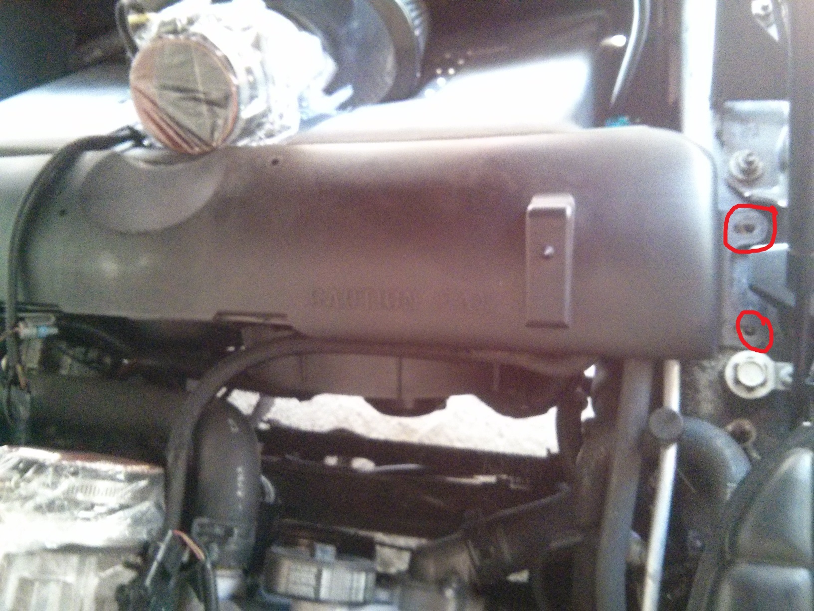 Die beiden Schrauben kann man nicht rausnehmen, dafür ist zu wenig Platz. Die Mutter auf dem Bolzen verhindert, dass der beim Rausheben in den Motorraum fällt.