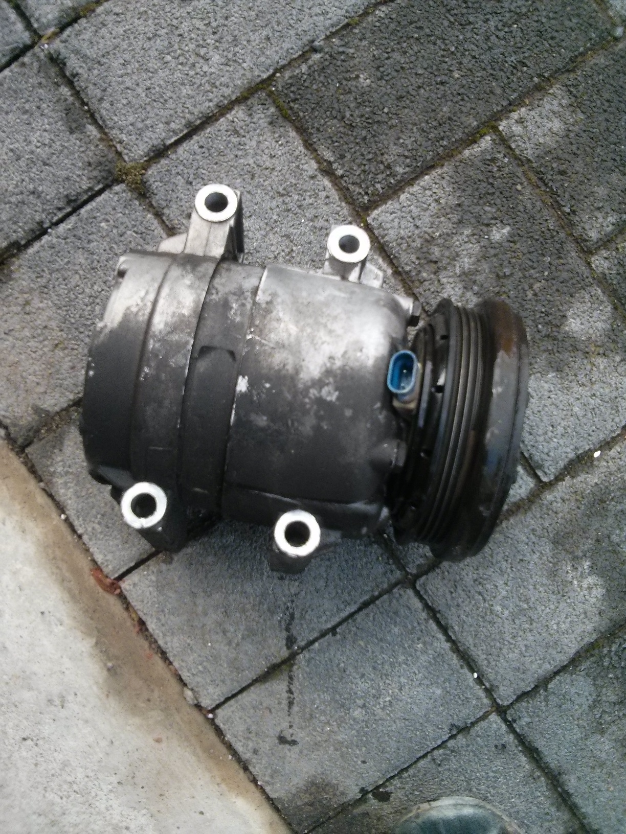 Der Kompressor sitzt beschissen unten am Motor, unter Krümmer und der Wapu. Leitungen zum Kondensator unten und zum Trockner. Krümmer oder Wapu werden raus müssen.