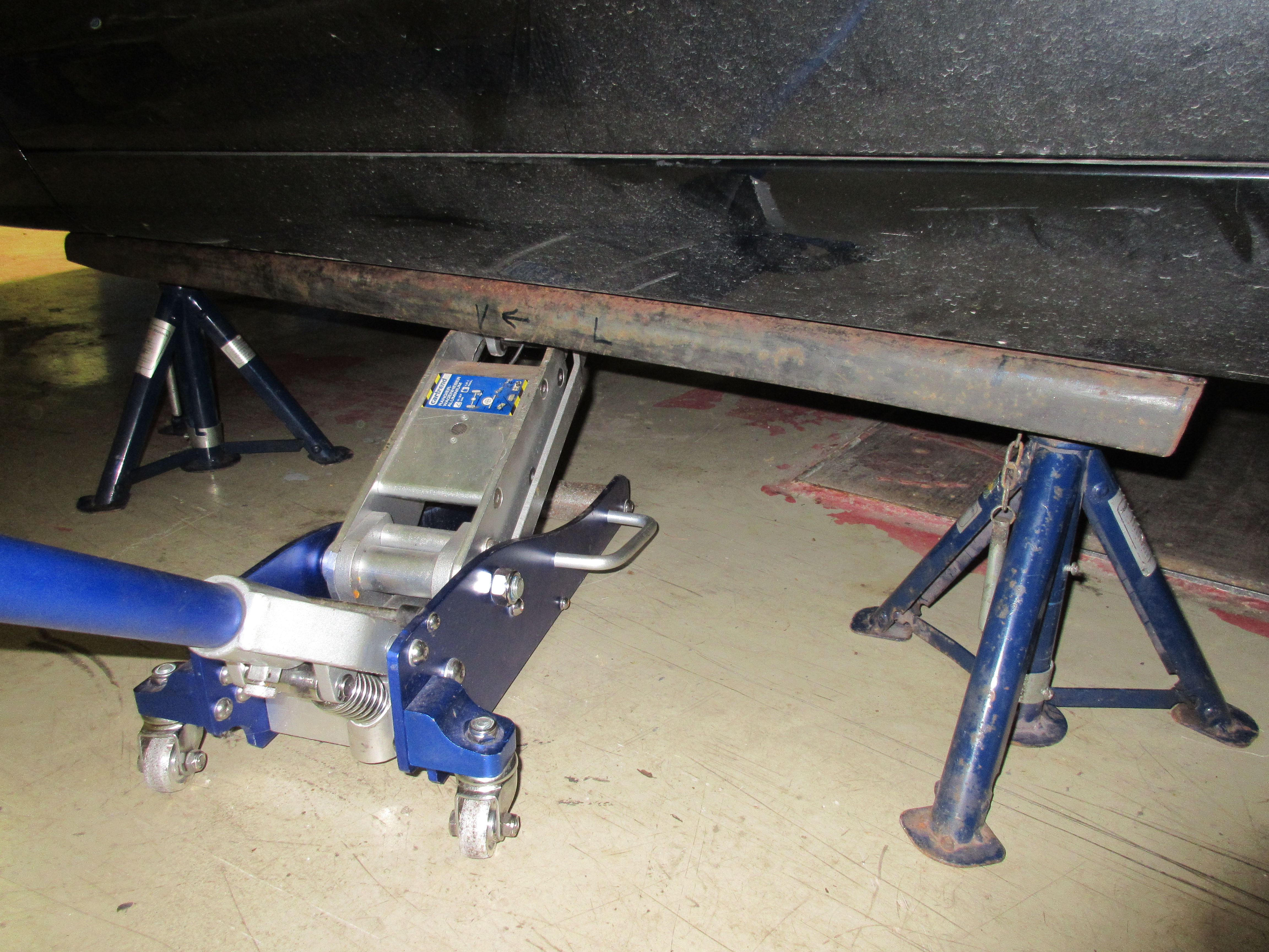Hilfsmittel im Einsatz: 1. Wagenheber 2. Stützböcke 3. selbst modifizierte U- Stahlprofilschienen.