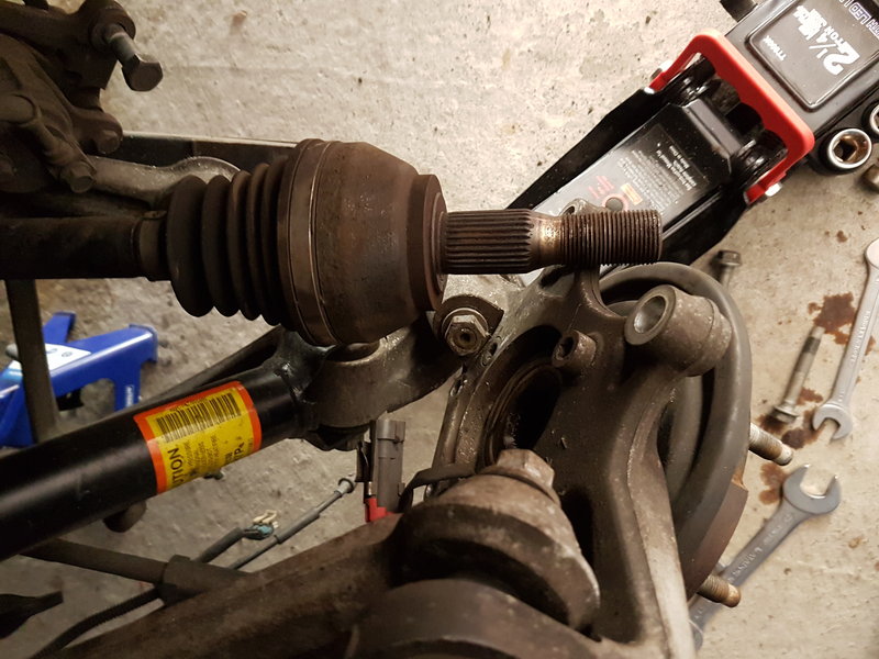Den Rest des Gewindes muss man über die Seite freidrücken. Eine Hand an die Achse und Richtung Differential drücken, andere Hand ans Radlager und zur Seite kippen. Braucht Kraft.
