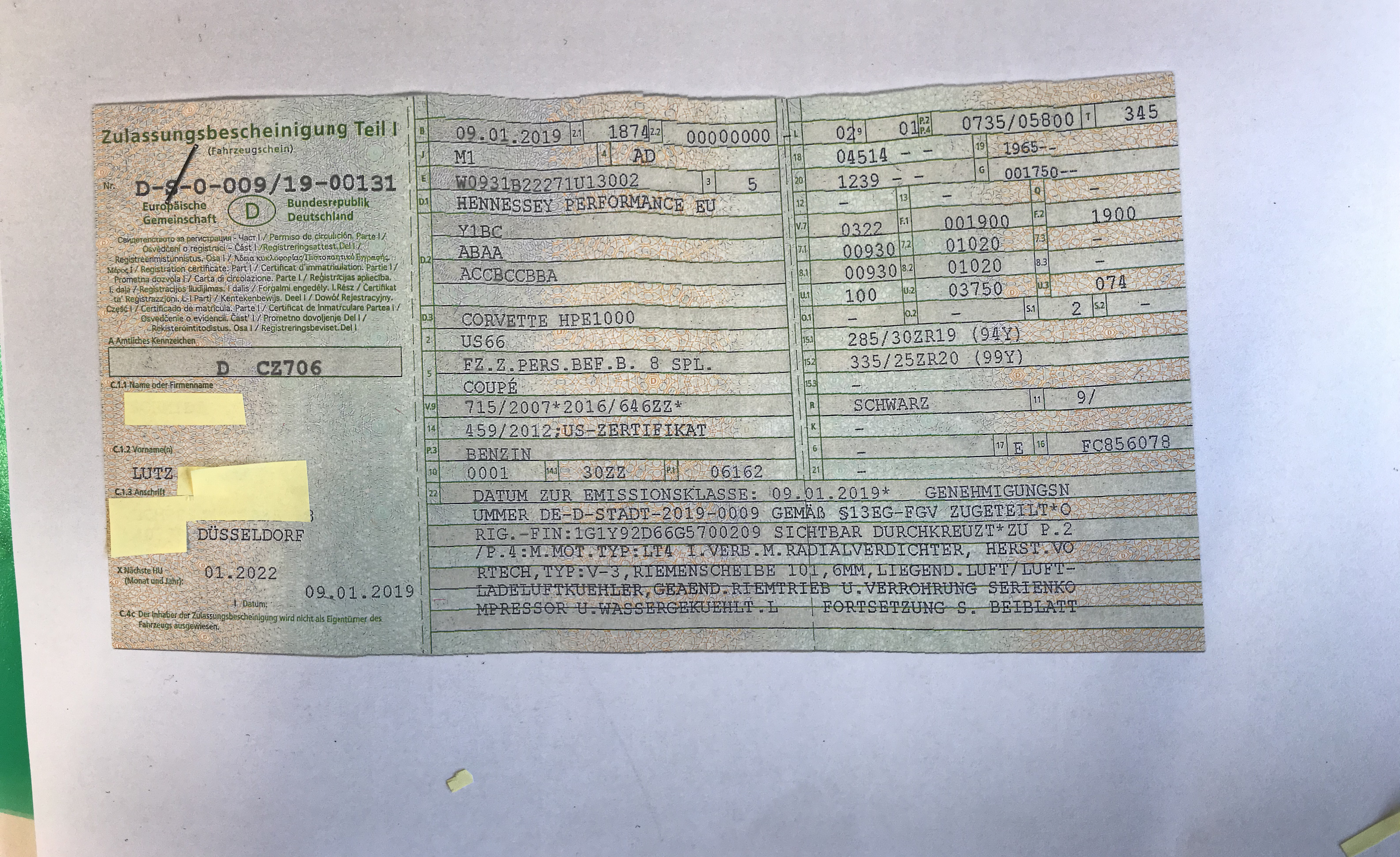 Liebe Freunde des Corvette-Tunings, anbei nunmehr als Beleg für die erfolgte Zulassung der HPE 1000 ein Photo des Fahrzeugscheins. Eingetragen sind 735 KW, d.h 1.000 PS. Hennessey hat als Hersteller die Schlüsselung US 66.