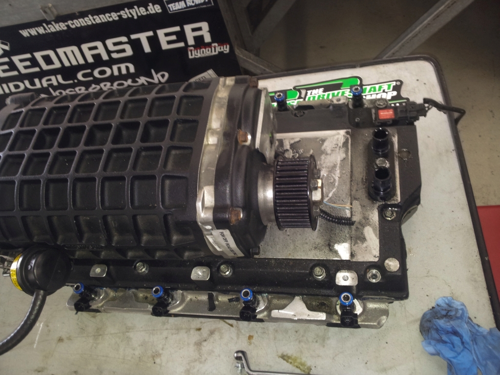 Der Kompressor bekommt nun endlich doch ein 8-Rib Drive. Im Moment wird der Blower noch von einem 6 Rippen Riemen und entsprechenden Pulleys angetrieben. Dieser Antrieb ist in seiner momentanen Form hoffnungslos am Limit. Schon auf dem Dyno hat sich gezeigt dass dieser Riemenantrieb nicht ausreicht den Kompressor ohne Durchrutschen des Riemens zu betrieben. Zumindest mussten wir die Spannrolle dermassen festknallen, dass man Angst haben musste, der Riemen würde bereits im Stand reissen...