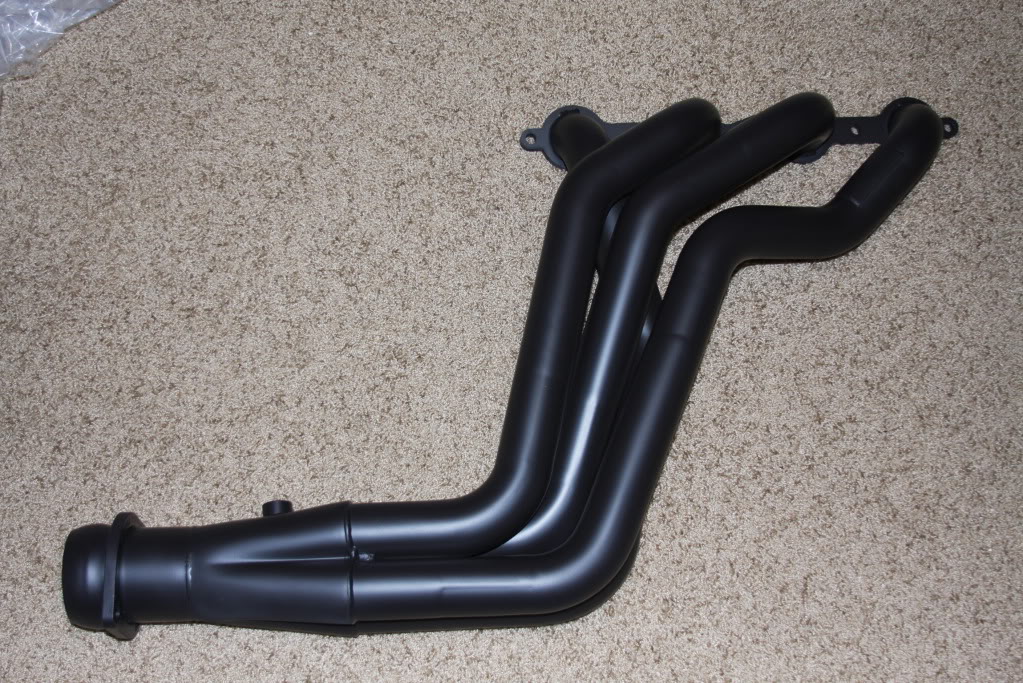 Um einlass-seitig mehr Luft rein, und auslass-seitig mehr Luft rauszulassen, fiel die Wahl auf den RotoFab CAI und auf Kooks Fächerkrümmer (1 7/8'') mit 200cpi HighFlow Kats. Für die hatten wir damals ein extrem günstiges Angebot von Maryland-Speed. Maryland hatte auch eine Keramikbeschichtung der Krümmer in Programm (JetHot2000 in Satin Black), die gabs glatt gratis noch oben drauf (wir hatten eine grössere Sammelbestellung am Start).