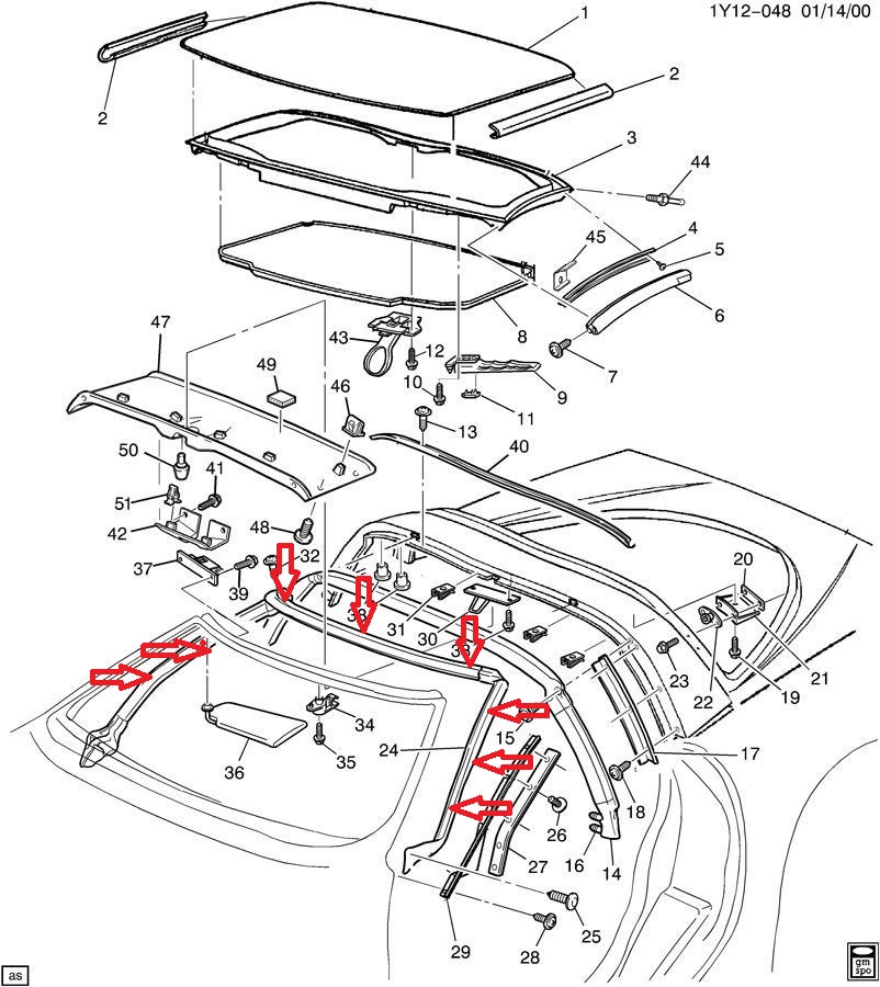 Ich würde diese vorzugsweise gegen eine neue und originale GM vordere Targadachdichtung tauschen (siehe Explosionszeichnung, rot markiert).