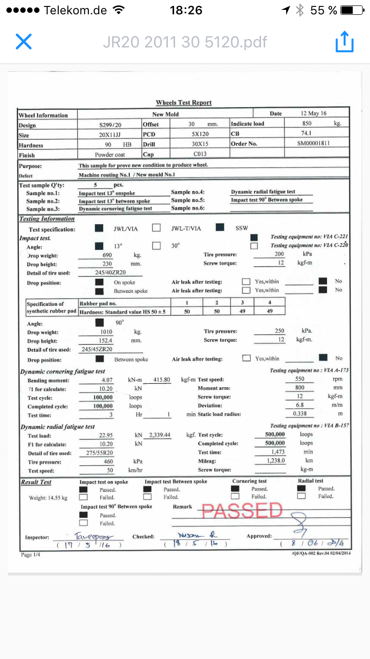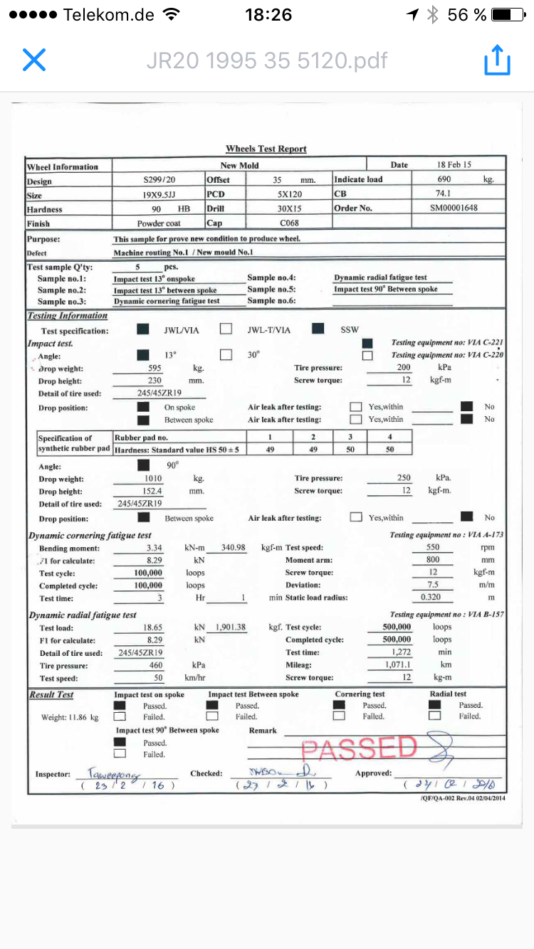 Hallo, muss erstmal die et berichtigen, die 9,5 x 19 hat et 42 die 20" stimmt so. Marke ist "Japan wheels" JR-20!! kein Chinaschrott!!