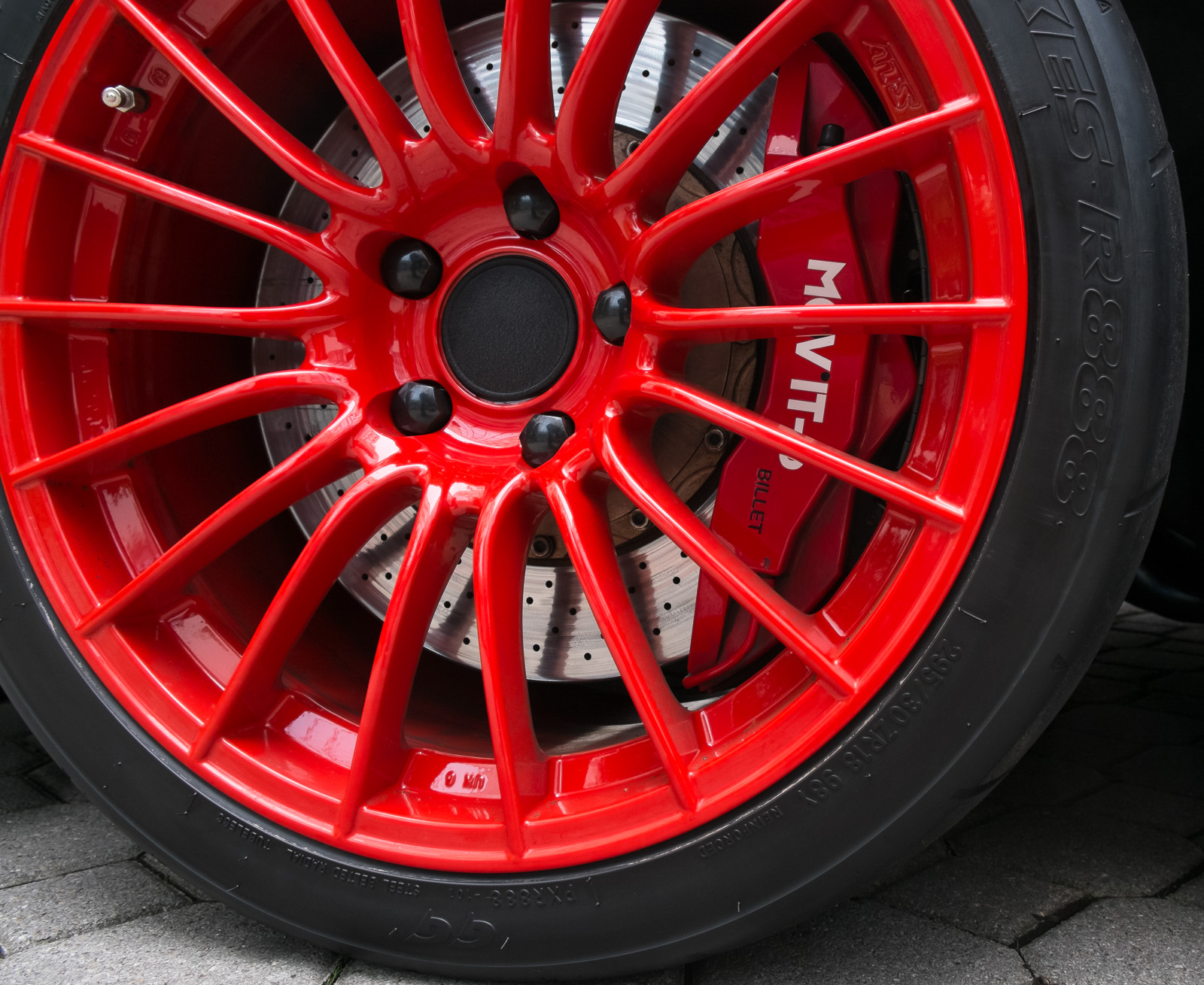 Die Felgen sind 11 x 18 und 13 x 18 groß. Aktuell sind vorne 295/30 und hinten 335/30 Toyo R888 drauf. Die hinteren Reifen sind runter und taugen vielleicht noch als Transportschutz.