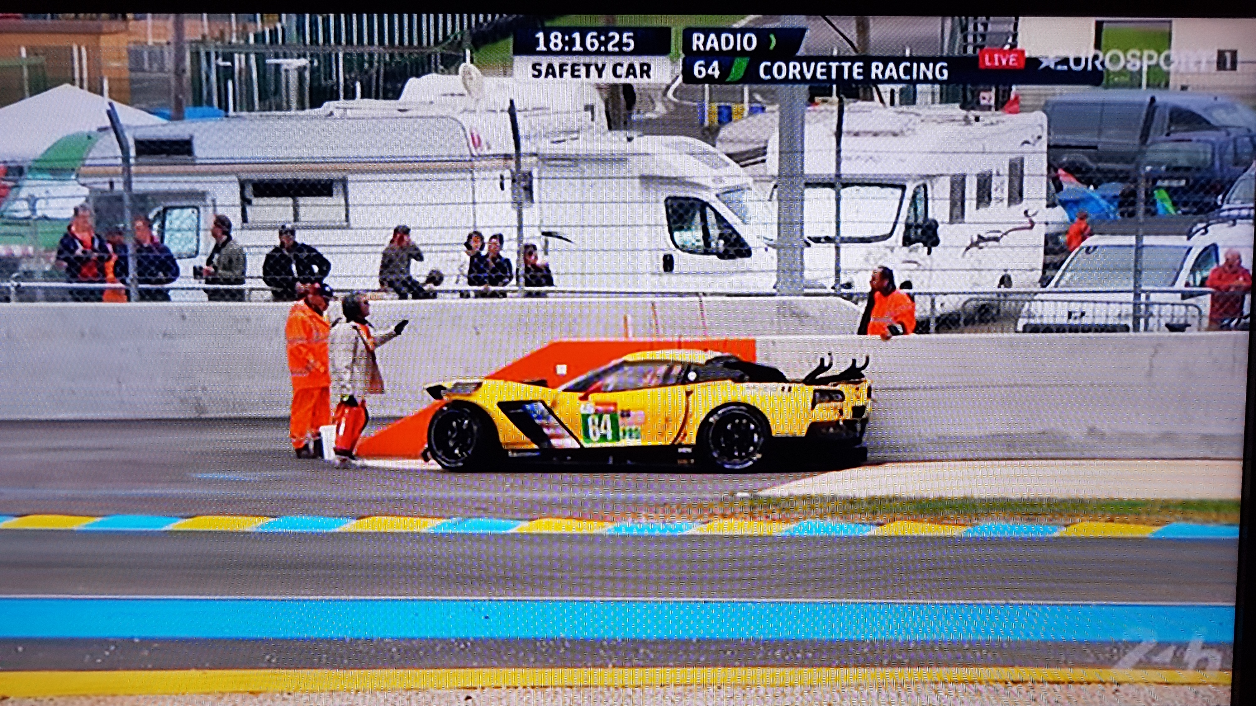 Die #64 Corvette mit Marcel Fässler ist gerade heftig abgeschossen worden. Schade.