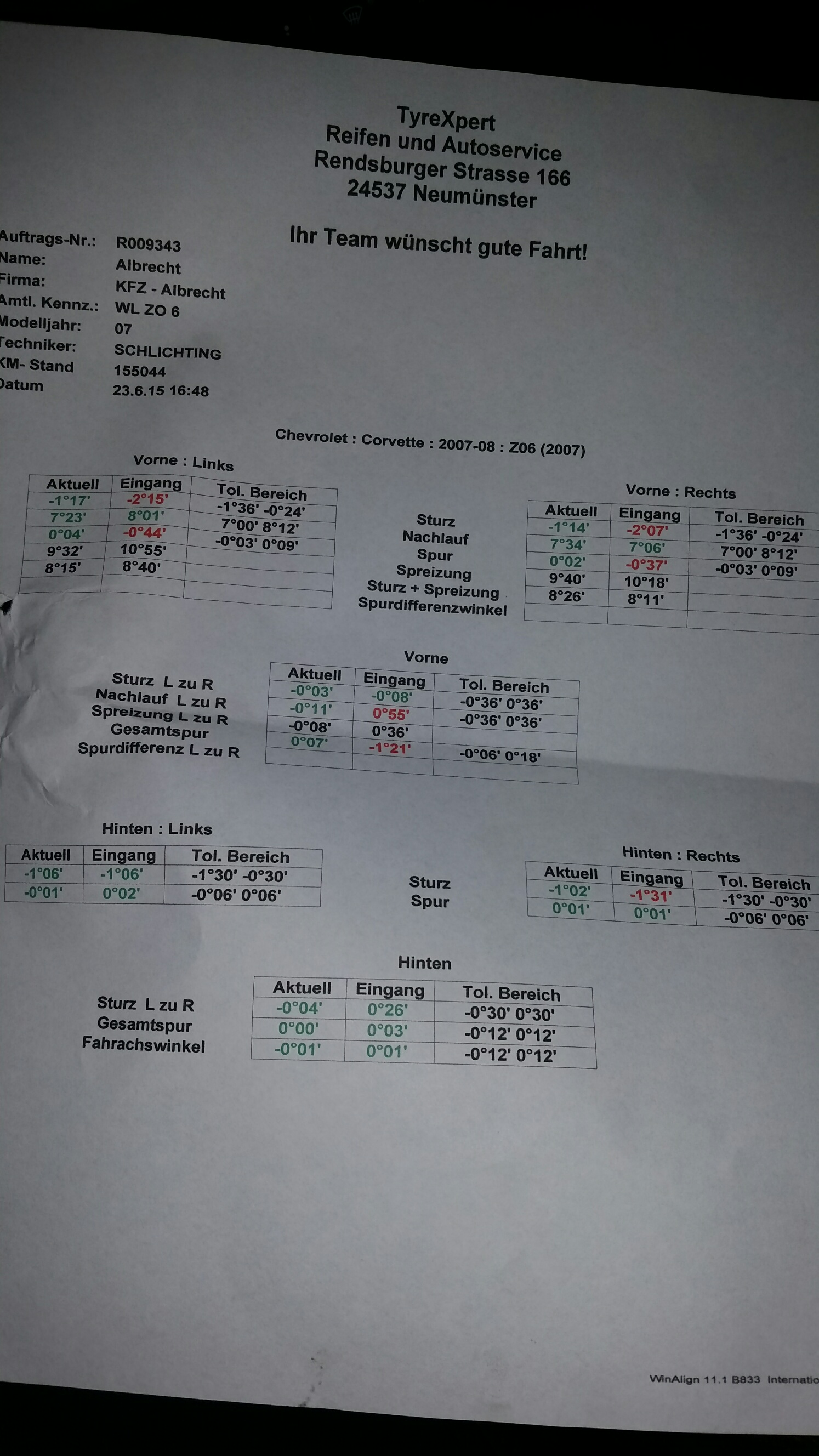 Am FW haben wir lediglich letzten Herbst (nach einer Probefahrt mit Opa und mir) eine Eingangsachsvermessung gemacht und da stand das Auto top, so das es keinen Grund gab daran etwas zu verändern, vor allem weil ganz klar zu hören war das die Buchsen hinten Geräusche machen, sprich diese eh irgend wann getauscht werden sollten!