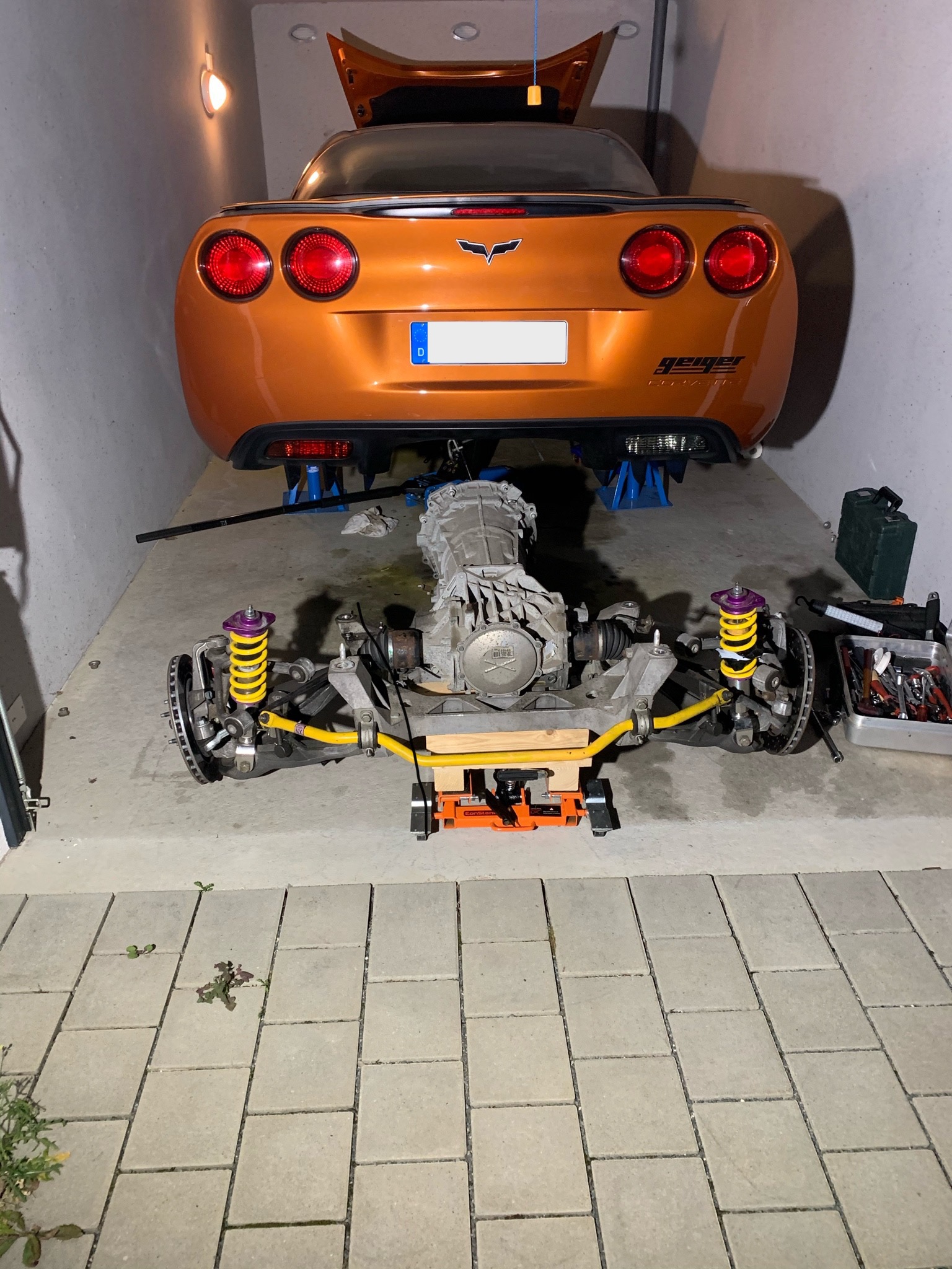 Hut ab! In so einer engen Garage so eine Operation durchzuführen ist schon eine große Leistung. Da ist doch seitlich gar kein Platz, die Räder abzumontieren.....!?