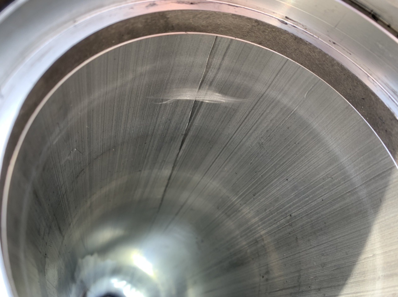 Da hatte ich an der einen Stelle schon mal mitm Finger drüber gewischt.. kein Riss, auch wenn es auf dem ersten Blick so aussah. Da kam wohl was beim Ziehen vom Rohr mit rein. Es ist auch unterhalb des angeschweißten Flansches und am Ende schön sichtbar endet es an der Lageraufnahme wo es freigedreht ist.