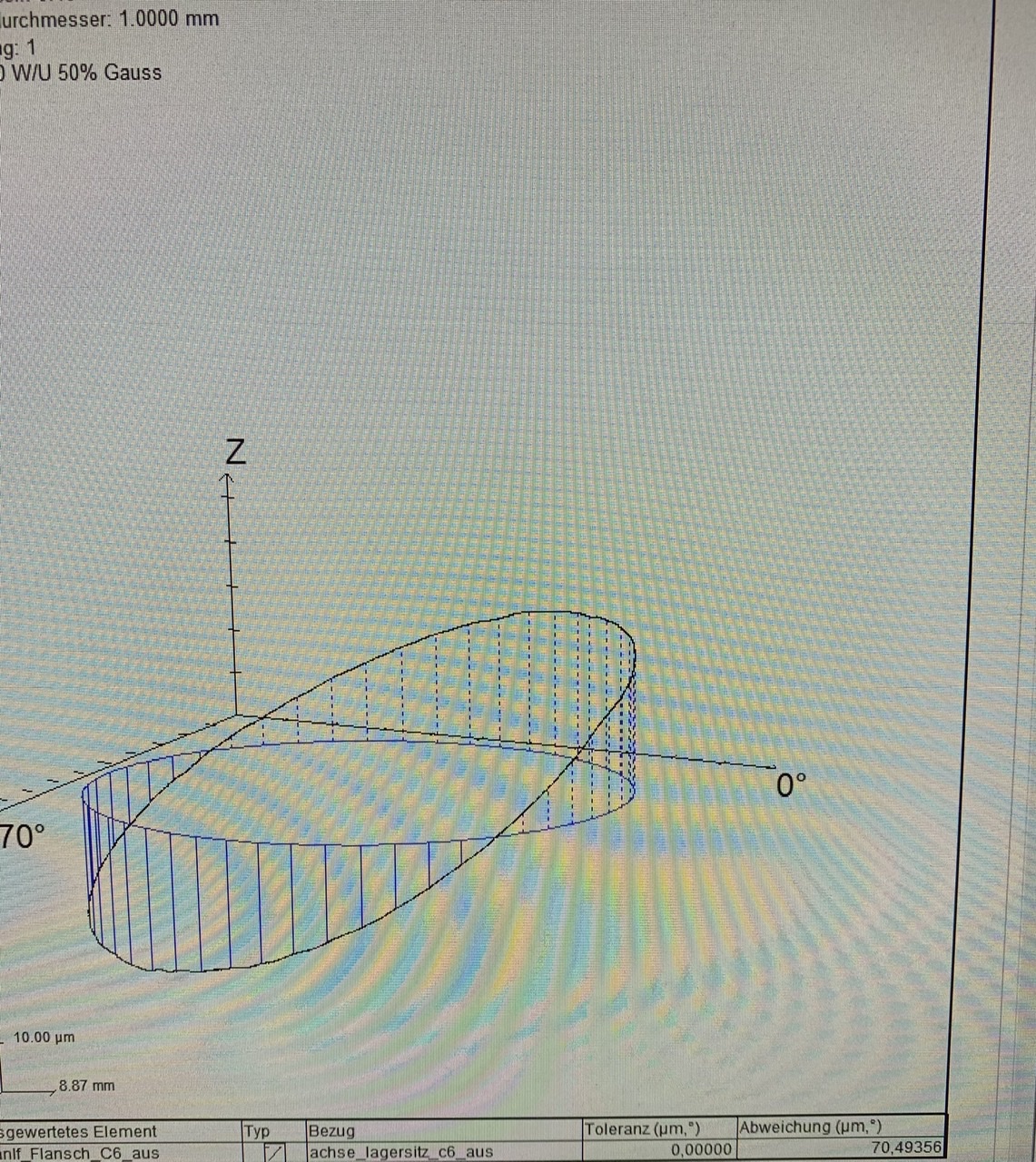 Das ist der Planlauf der Fläche, an der die Flywheel- Scheibe montiert wird. Die Bezugsachse sind wieder die zwei Kugellagersitze.