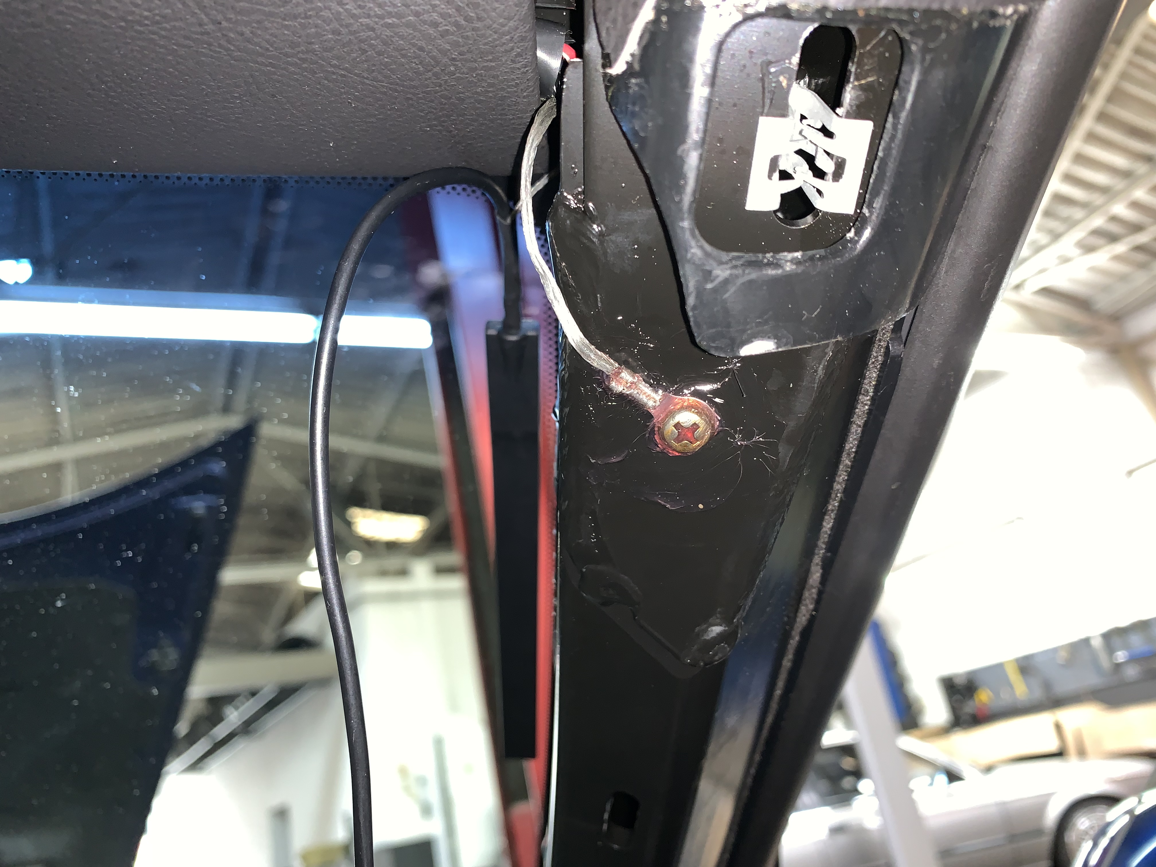 Ich habe in der A-Säule auf der Beifahrerseite in einem Blech ein kleines Loch gebohrt und ein M4 Gewinde gebohrt.