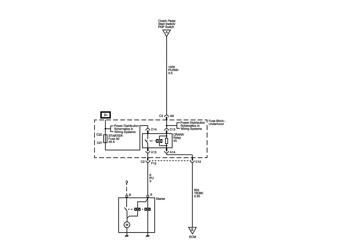 Von dieser Sicherung laufen die 12 Volt zum Kupplungspedalschalter. Bei getretener Kupplung legt der Kupplungspedalschalter die 12 Volt dann auf Pin C13 des CRANK Relay im Motorsicherungskasten.