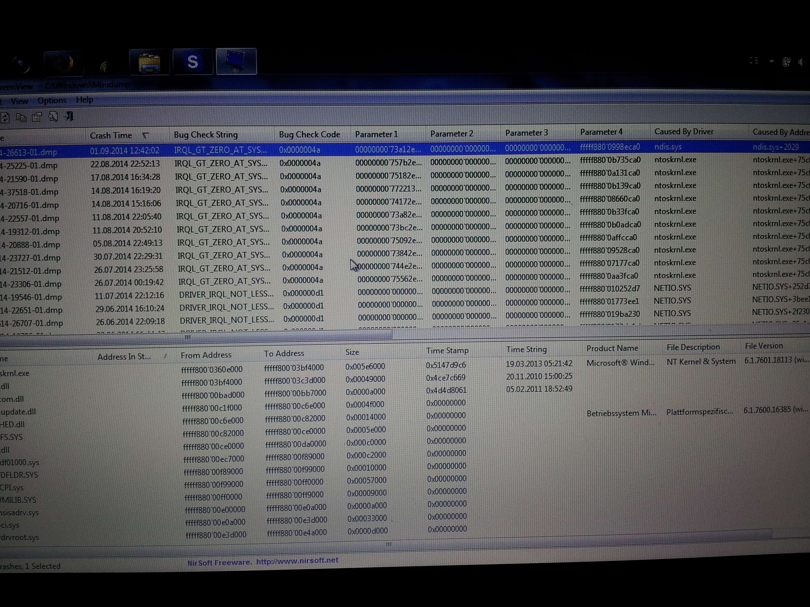 Speicher doch mal deine ausgelesenen Ergebnisse und lad sie hoch, der erste Fehler sieht nach einem Problem mit deinem Netzwerkkarten Treiber aus.