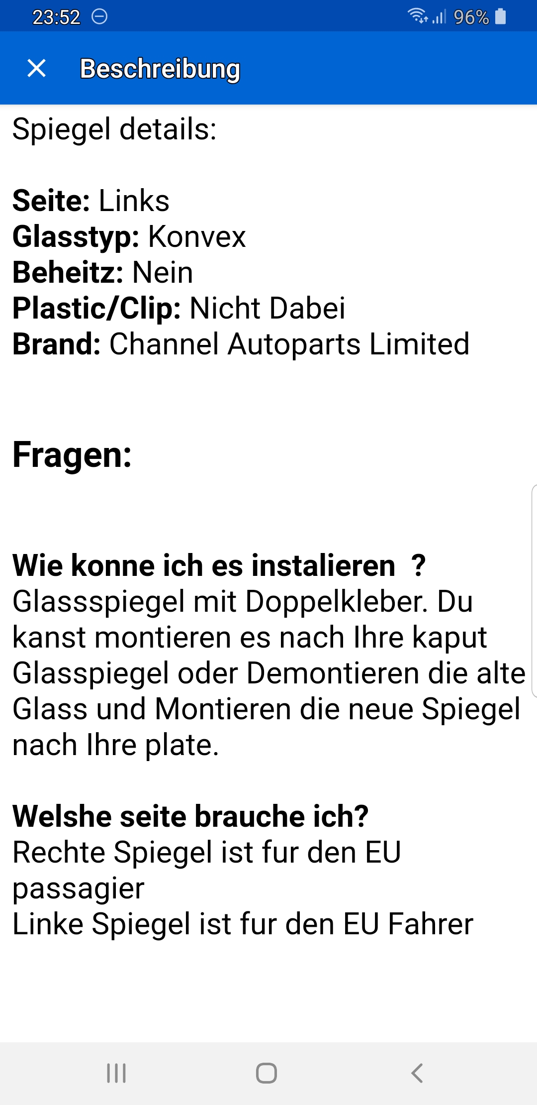 Ein Spiegelglas vom linken Außenspiegel brauch ich. War gesprungen und er hat einfacg ein anderes drübergeklebt. Erfüllt zwar seinen Zweck, aber mir gefällt es nicht. Schaut nicht schön aus.