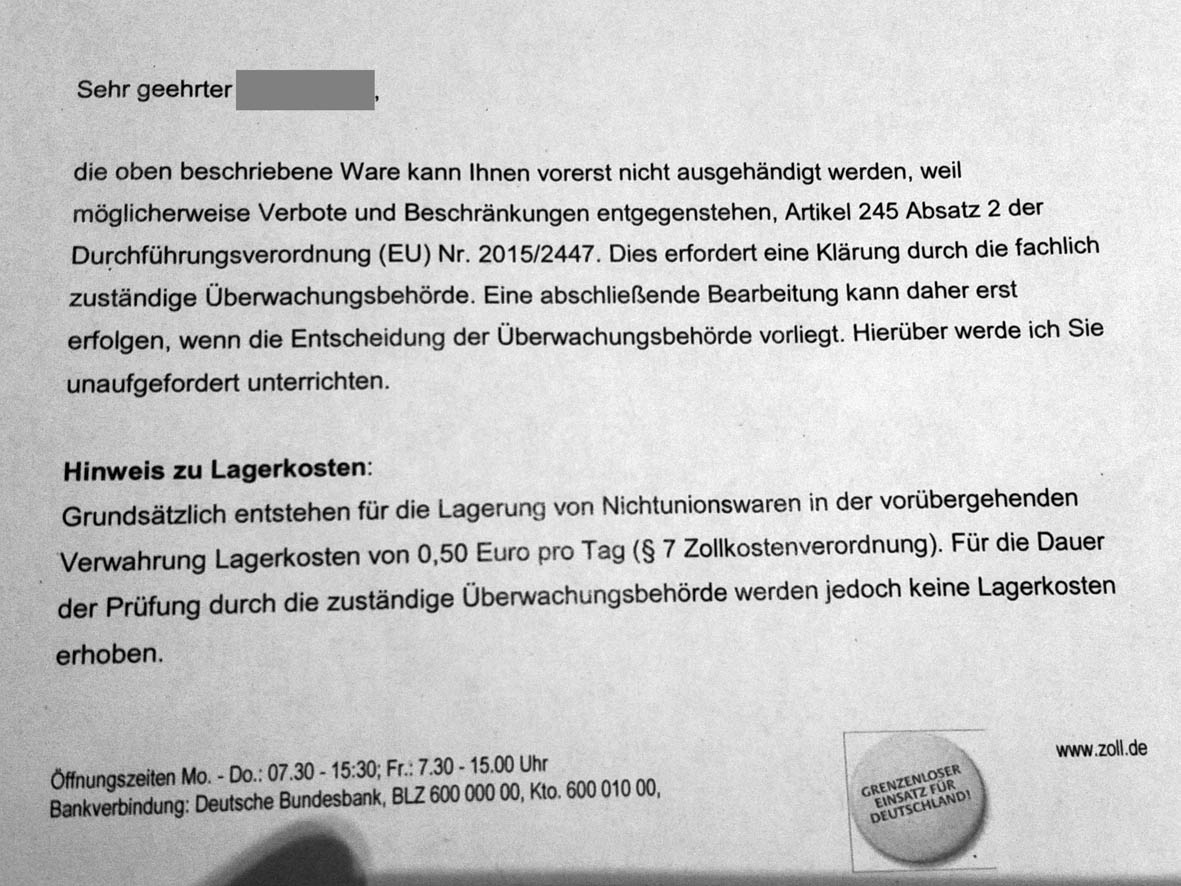 Ich werde im "Transporthilfeforum" noch einen Thread machen ob jemand die Ware für mich beim Zoll annehmen kann und sie mir schicken... falls jemand im EU-Ausland